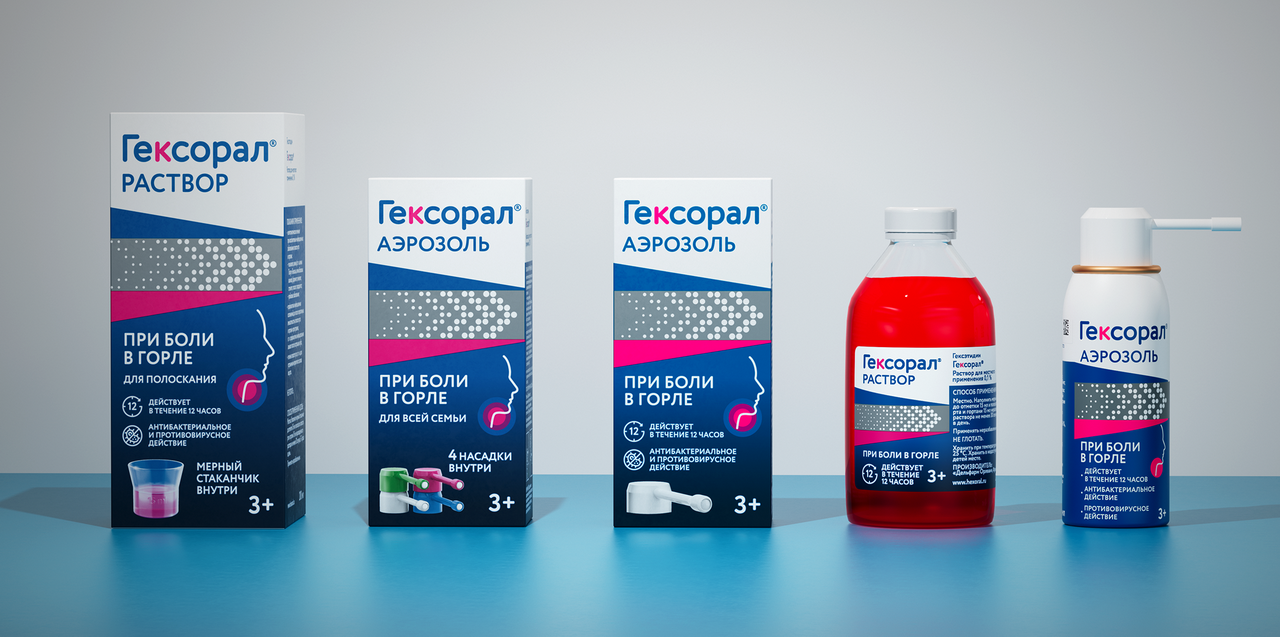 Команды бренда Гексорал® и агентства Mildberry провели комплексное обновление всей продуктовой линейки. Сегодня портфель бренда включает четыре средства от боли в горле, выпускаемые в двух форматах: аэрозоль и таблетки для рассасывания различной интенсивности воздействия.