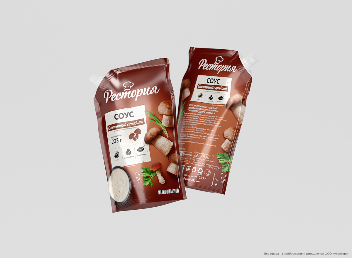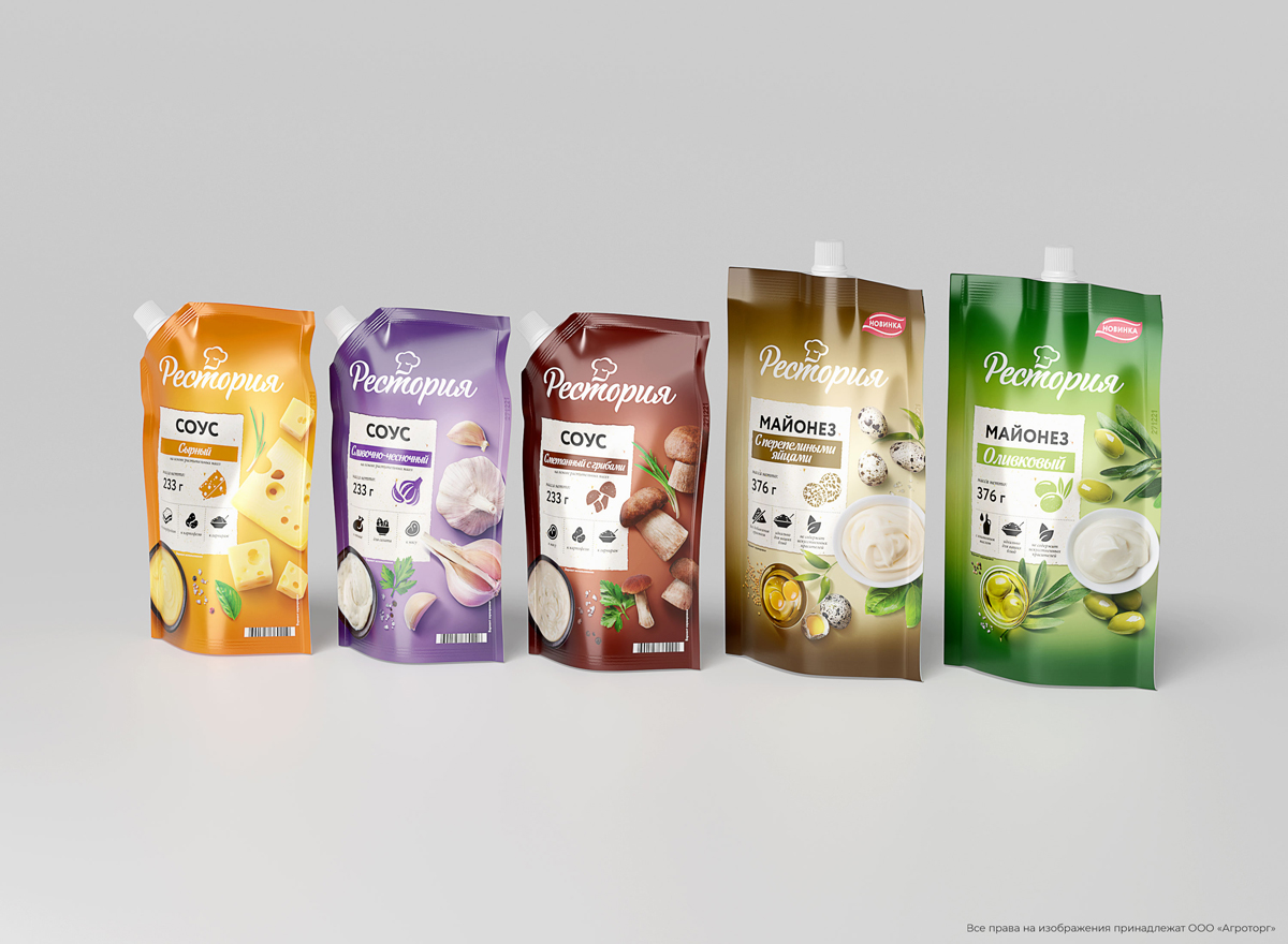 Агентство адаптировало дизайн-концепции на новые вкусы соусов и майонезов, собрав уникальные фудгруппы для каждого продукта, при этом сохраняя преемственность концепта товарной марка «Рестория». Создав понятную дифференциацию вкусов, дизайнеры также сохранили на всех продуктах единое расположение бренд-блока.