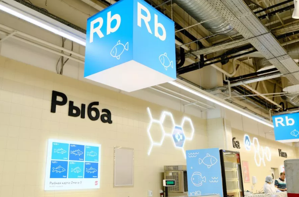 Все отделы имеют тематический дизайн и названия. Например, отдел косметики именуется «Формула красоты». А лайтбоксы с сервисными коммуникациями подскажут покупателю, в частности, «Формулу идеального салата». У торговых категорий также появились тематические пиктограммы в стиле таблицы Менделеева. Например, молочные продукты обозначены пиктограммой «Mo», бакалея — «Bk», детские товары — «Dk» и пр.