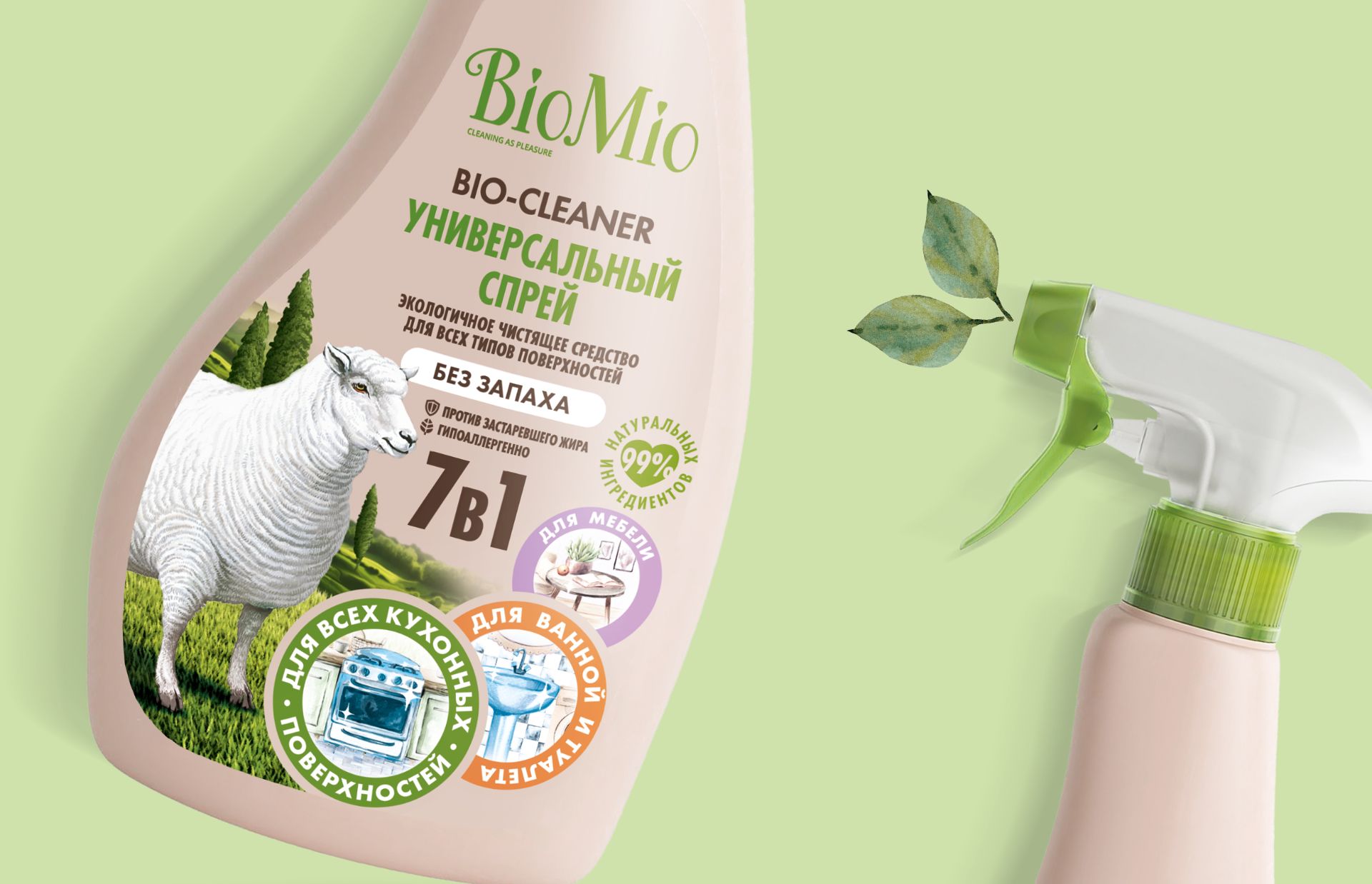 После того как с заднего фона убрали все лишнее, упаковка обрела четкую структуру: бренд-блок с овечкой в левой части, справа по классике расположились все категорийные клеймы все лишнее «7 в 1», «для всех кухонных поверхностей, мебели, ванной и туалета».