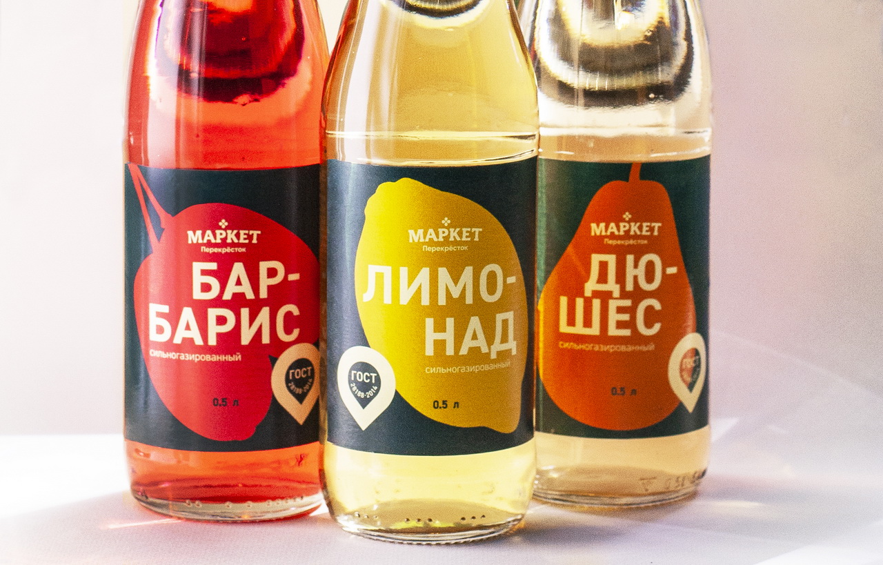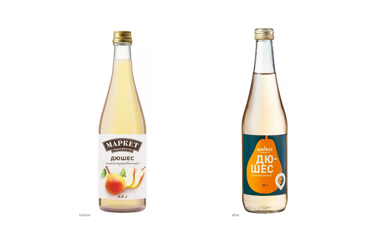 Так, в предыдущем дизайне от самого напитка сильно отвлекал логотип бренда «Маркет Перекрёсток», а визуализации барбариса или тархуна не ассоциировались с натуральностью продукта. Обилие шрифтов тоже не добавляло ясности.