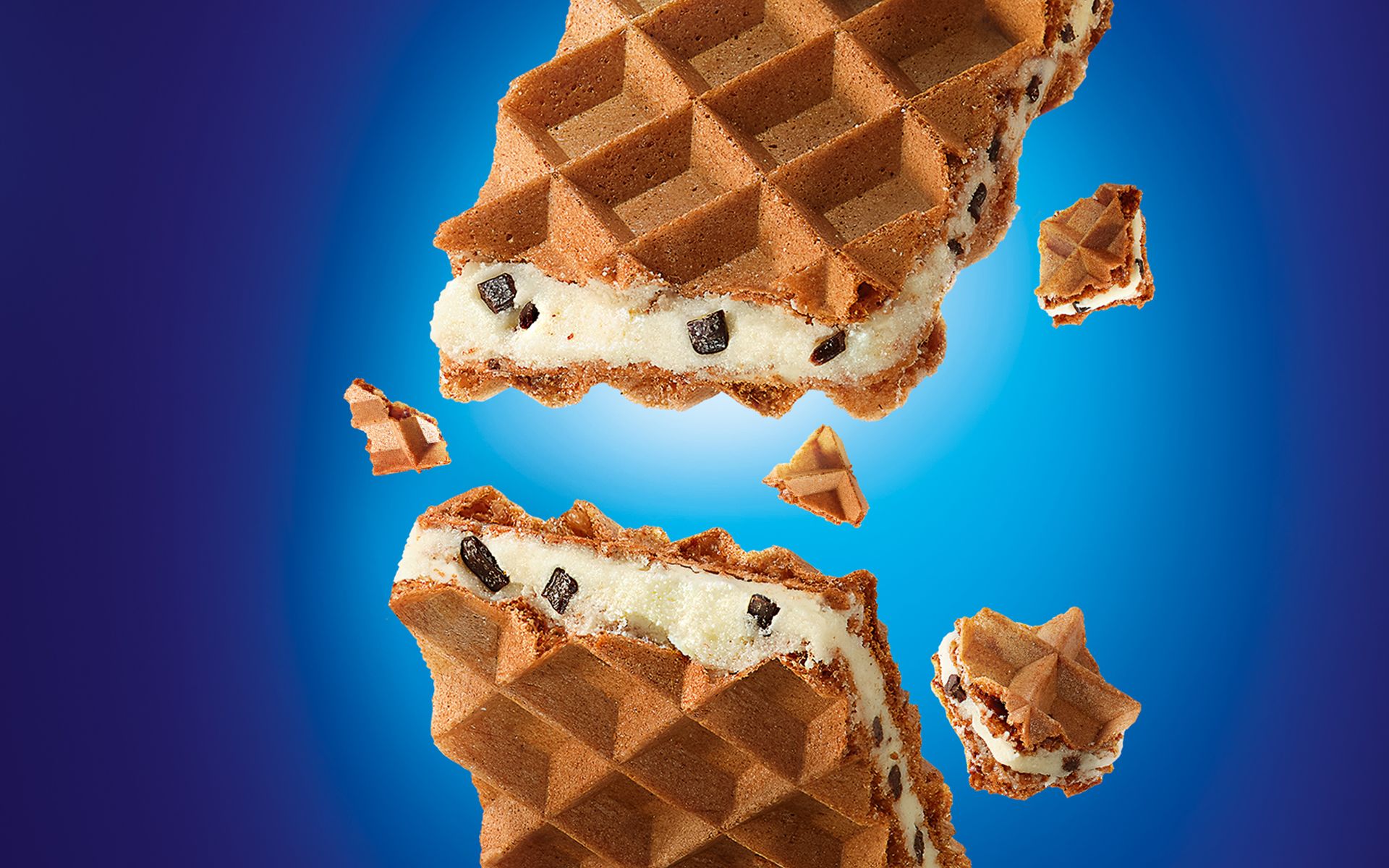 Основные эмоции, которые нужно было передать через дизайн — это удовольствие от вкуса. Поэтому большое внимание дизайнеры уделили фуд-зоне. Они показали вафлю в разломе, от которой разлетаются кусочки, чтобы подчеркнуть характерный хруст вафель, а также чтобы продемонстрировать толстый слой сливочной начинки с вкраплениями кусочков темного шоколада. Фуд-зона подсвечена голубым, чтобы сфокусировать внимание на вкусе. Сам фон упаковки темно-синий — фирменный цвет бренда. Клейм «настоящий шоколад» подчеркивает преимущество продукта.