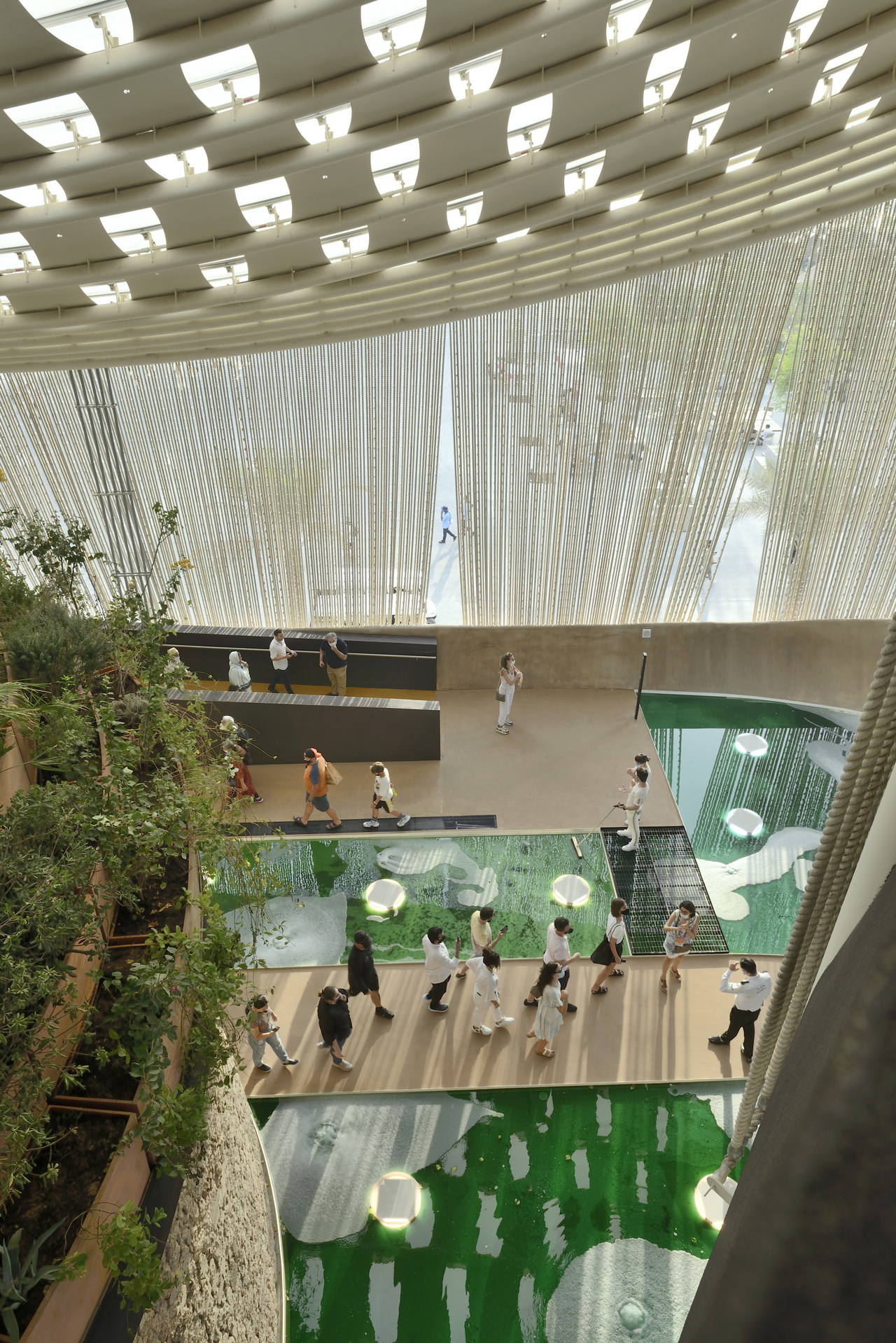 Стены, как таковые, здесь отсутствуют. Вместо это фасад здания — это своеобразная занавеска из морских верёвок, изготовленных из 2 млн. переработанных пластиковых бутылок. Верёвки, которые будут использованы повторно после разбора павильона, формируют сеть, которая тянется почти на 70 км. В неё встроена светодиодная подсветка, которая позволяет создавать мультимедийные сообщения на фасаде павильона, пишет Upakovano.ru.