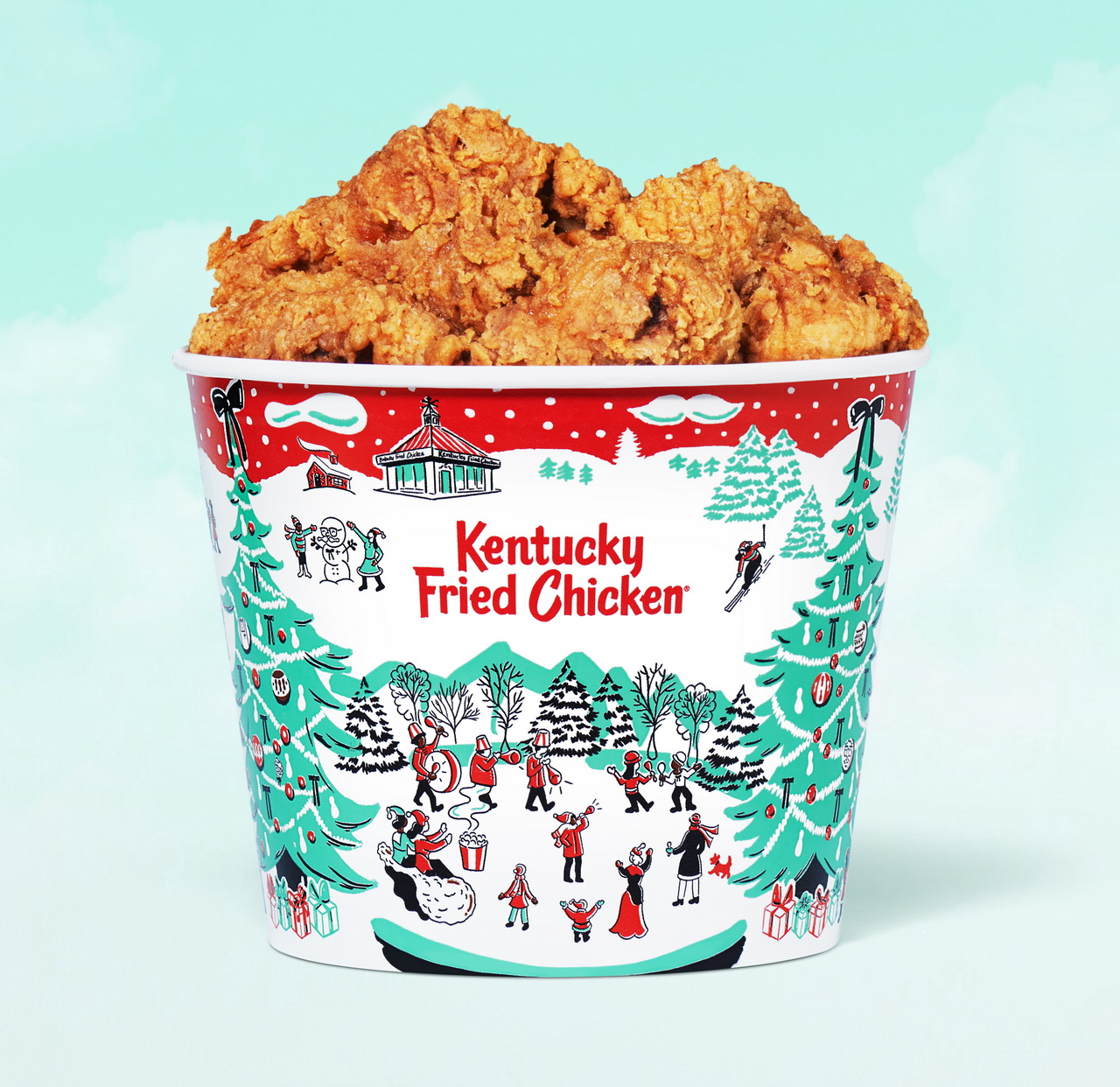 Помимо него, сеть KFC представила сезонный дизайн самих баскетов, получивший название Winter Chickenland («Зимняя куриная страна»), пишет Upakovano.ru. На упаковках можно увидеть покрытое снегом пространство, на котором собрались люди, а также украшенные ели и снеговика, напоминающего самого основателя сети — полковника Сандерса.