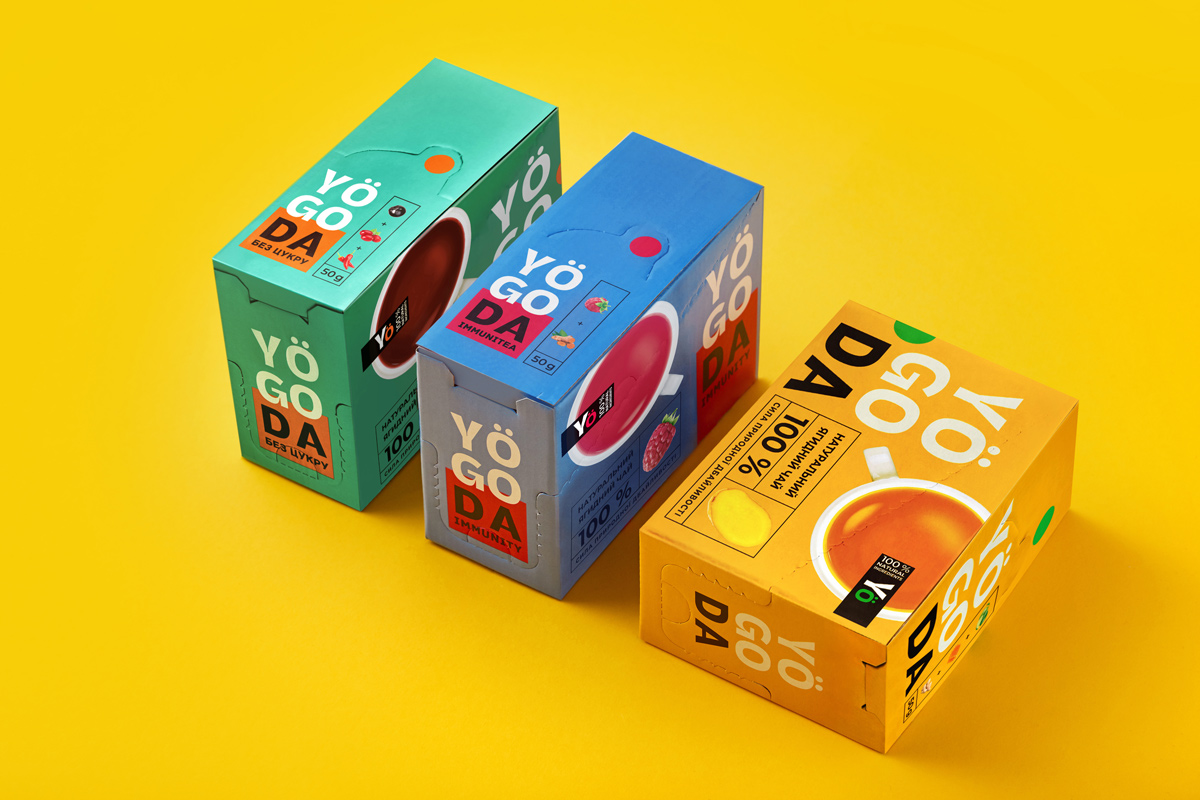 Ягодный чай ассоциируется с позитивными эмоциями, здоровьем и расслаблением. Все это собрано в фантазийном нейме Yogoda — ярком сочетании слов «йога» и «ягода». Для создания логотипа использована шрифтовая разбивка имени на три блока. Последний слог, выделенный цветом, трансформируется в позитивный посыл «Да!».