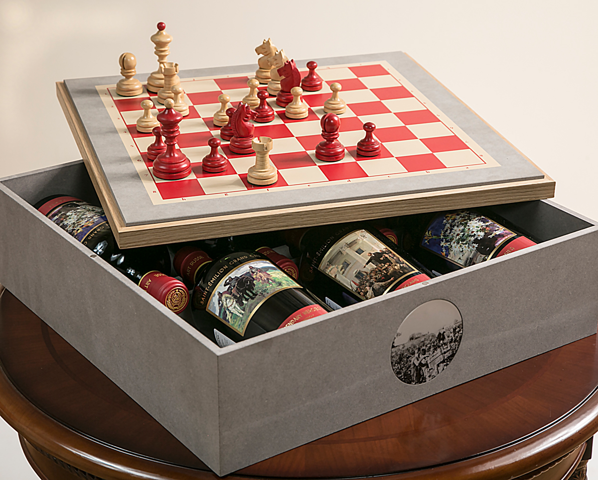 Специальный подарочный шахматный кейс Art Russe был разработан командой шато в 2014 году в дань уважения древней интеллектуальной игре, объединив искусство шахмат, живописи и виноделия. Элегантный деревянный ящик с крышкой-шахматной доской для шести бутылок знаменитого вина из Сент-Эмильона с картинами русских художников на этикетках укомплектован набором шахматных фигур, сделанных вручную по индивидуальному проекту. При изготовлении кейса применены качественные натуральные материалы — дерево, валкромат (valchromat)и кожа.