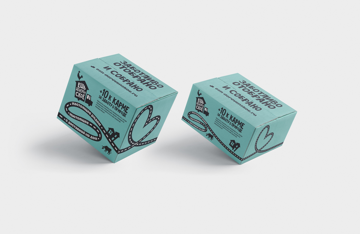 Главными элементами айдентики стали изображения машины с домом и дороги в виде сердечка, что олицетворяет заботливую доставку натуральных фермерских продуктов. А чтобы усилить коммуникацию и придать бренду яркость и дерзость, появился самостоятельный персонаж — Петух. Он является самым быстрым способом сказать «Ешь Деревенское» без слов.