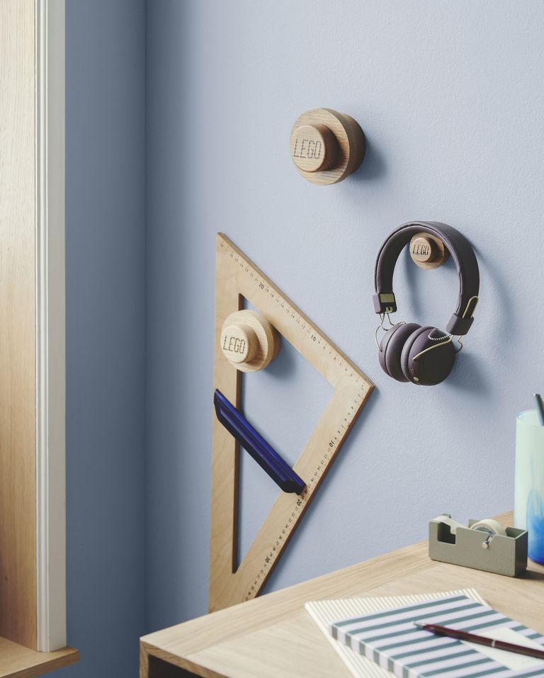 «Кирпичики» сделаны из дуба, и их можно ставить друг на друга. Разработаны товары вместе с датским дизайнерским брендом Room Copenhagen. В коллекцию вошли рамки для фотографий, крючки для стен, книжные полки и выдвижные ящики. Каждый предмет — это по факту увеличенная копия обычного кирпичика LEGO с точными масштабами. Как результат, выдвижные ящики и рамки для картин можно ставить друг на друга.
