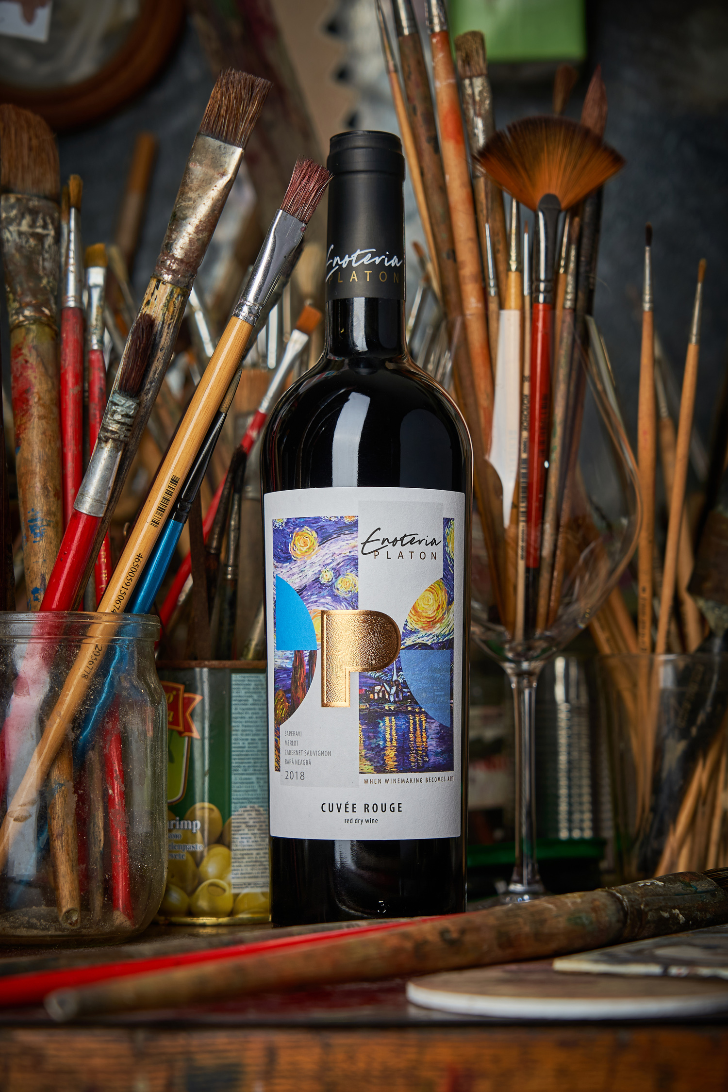 Дизайн этикетки воплощает эту идею в визуальной плоскости, используя стилистику картин совершенно разных художников и эпох как дизайн элементы, которые в итоге составляют уникальную композицию. Центральным же элементом на всех этикетках выступает заглавная буква P, указывающая на фамилию производителя Platon, и выполненная при помощи техник золотого тиснения и 3D конгрева. В совокупности, все эти элементы собираются в единый яркий образ, отличный для каждого отдельного вина, но неизменно яркий и узнаваемый, особенно когда на полке выстраивается сразу несколько творений винодельни.