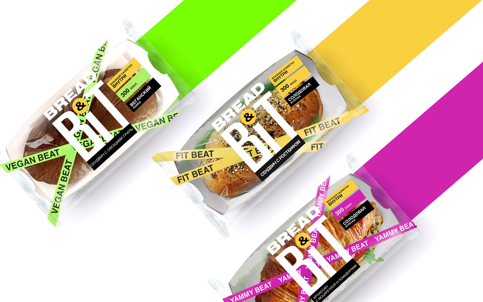 Bread&Bit — это коллекция из 9 сэндвичей на любой вкус в удобной упаковке формата to go с влажной салфеткой внутри. Яркая эмоциональная упаковка с интересным логотипом заметно выделяется в среде и на полке.
