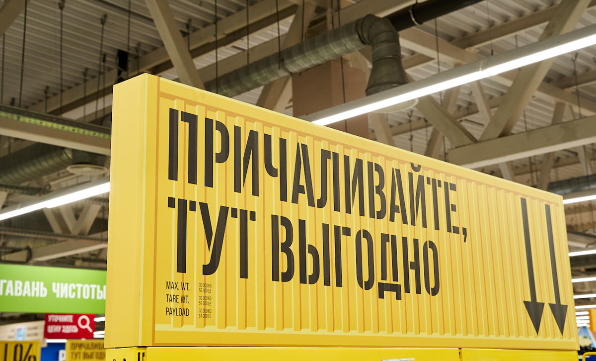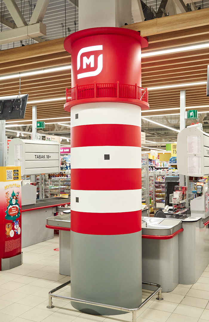 В основе навигации — марки, на которых изображены основные категории продуктов. Найти нужный отдел покупателю помогают тематические вывески. Так, здесь можно встретить «Молочный залив», «Сырный причал», «Причал сладостей», «Хлебную бухту», «Мясной остров», «Колбасный пирс», «Остров чистоты», «Детский остров» и пр. Зона с акционными товарами оформлена в виде желтых грузовых контейнеров, которую подчеркивают вывески с надписями «Причаливайте, тут выгодно!», «Держим курс на лучшие цены!» и пр. Атмосферу дополняет инсталляция в виде маяка.