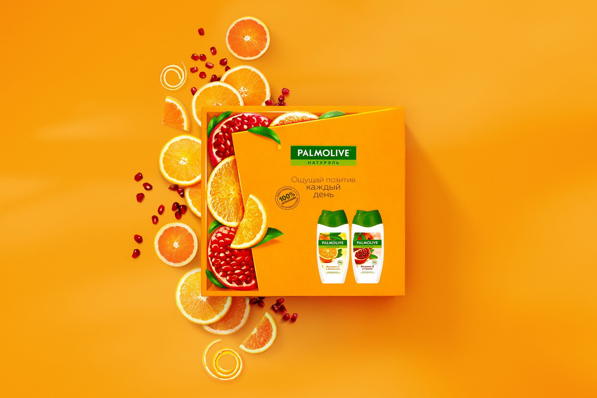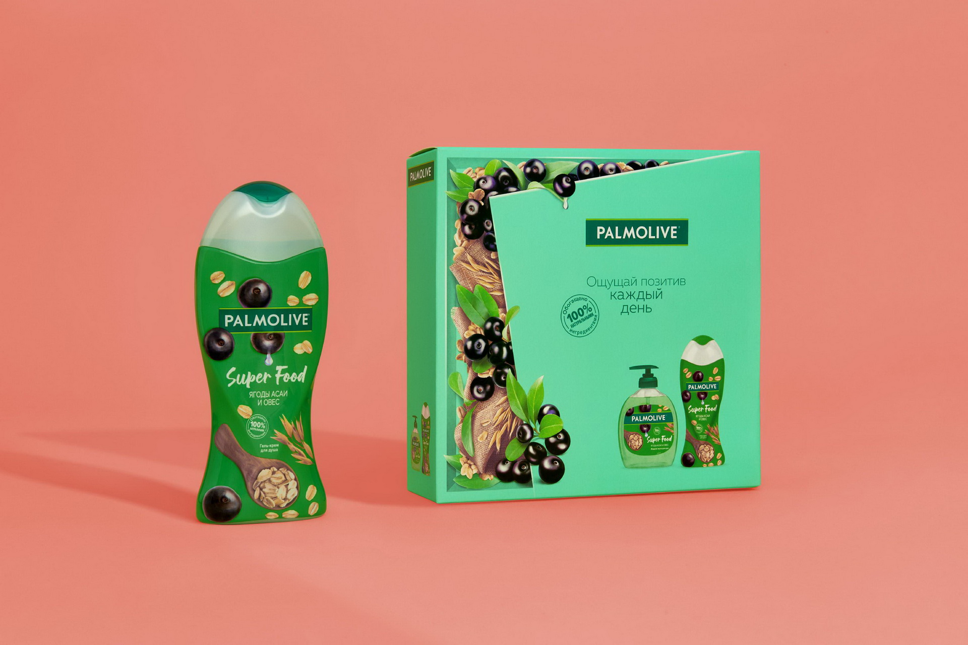 На упаковке буквально проиллюстрирован момент распаковки подарка. Содержимое под приоткрытой крышкой различается в зависимости от линейки. Это могут быть спелые фрукты, цветы, зеленые ветви, ягоды — натуральные ингредиенты в составе косметики. Новый дизайн без излишеств акцентирует внимание на главном: это особенный момент близости и энергия природы в каждом средстве Palmolive.