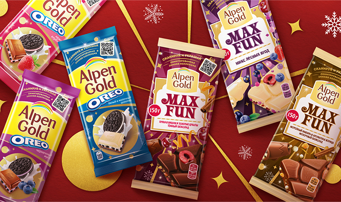 Яркий игрок на рынке сладостей Alpen Gold также готов встречать Новый год во всеоружии. Бренд искрится на полках за счет насыщенных цветов, динамичных фудгрупп и праздничной символики. Эти элементы дизайнеры отразили в упаковках классического шоколада, Alpen Gold Max Fun, Alpen Gold Oreo, а также на новом индивидуальном формате шоколада.