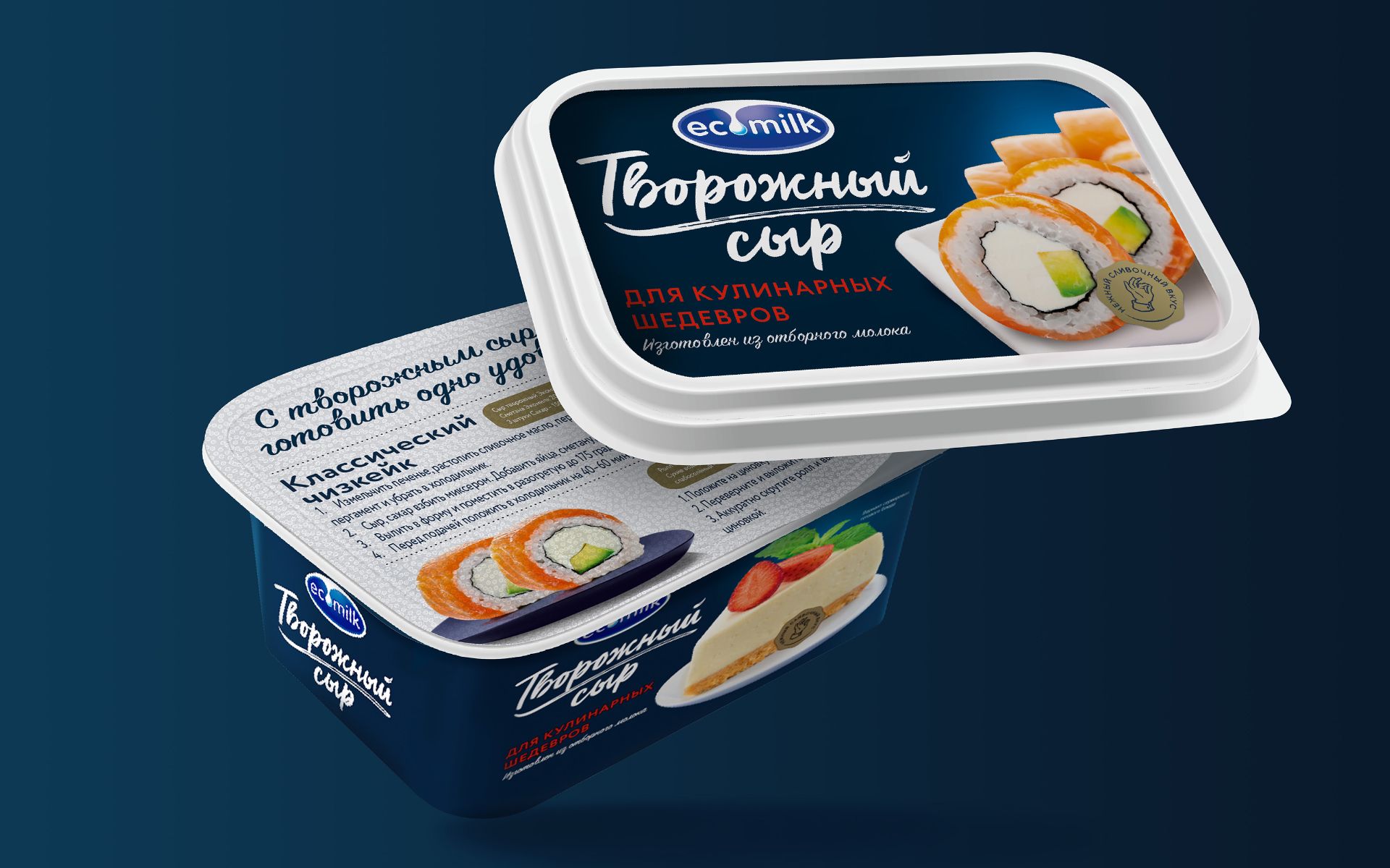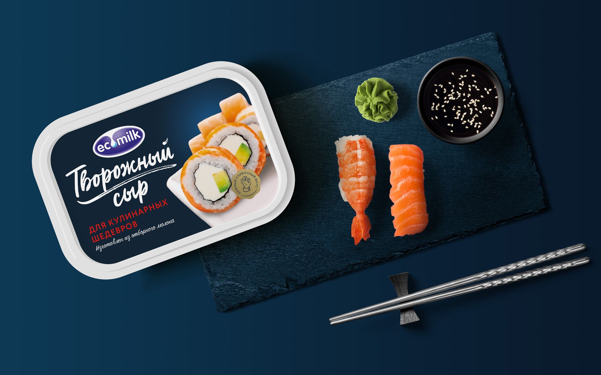 Сам дизайн имеет классическую архитектуру: логотип Ecomilk, крупно прописанная категория продукта и демонстрация блюд, основным ингредиентом которых является творожный сыр — это и суши, и чизкейк, и ватрушки, и сырники.