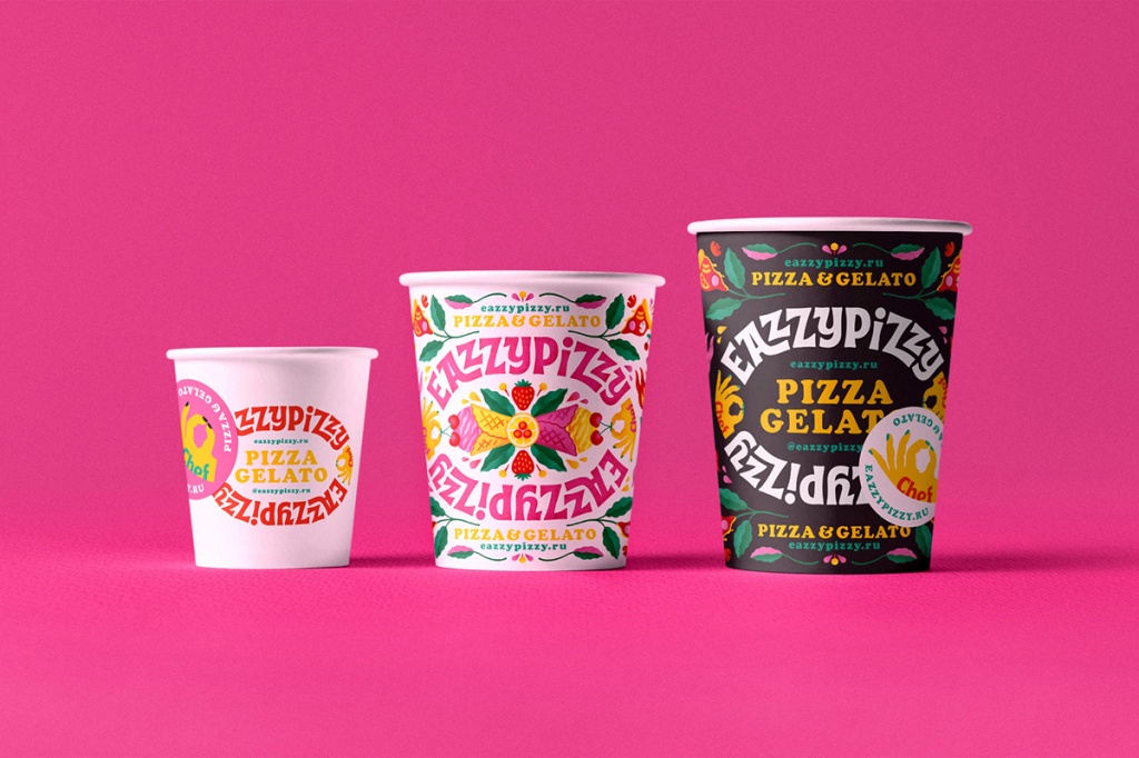 Дизайнеры так рассказали о проекте: «Главной фишкой продукта стала миксология разнообразных вкусов: сладкого, солёного, кислого, горького, и т.д. Поэтому при разработке айдентики мы использовали визуальный приём противопоставления, чтобы точнее передать идею и особенность бренда. В фирменном узоре, например, можно увидеть кусочек пиццы с апельсином, шарики мороженого с томатом, плавленый сыр и сладкий крем, клубнику и салями. Логотип «стадион» напоминает характерную продолговатую форму пиццы и читается с любой стороны, как ни крути! Руки шеф-повара добавляют специи, делая эмблему еще более пикантной».