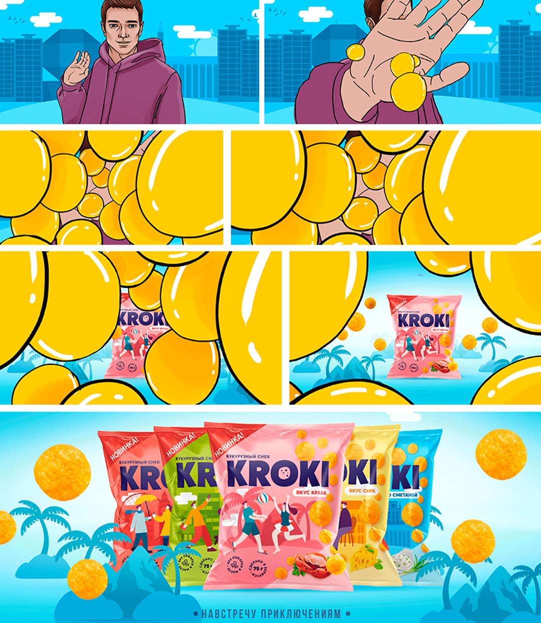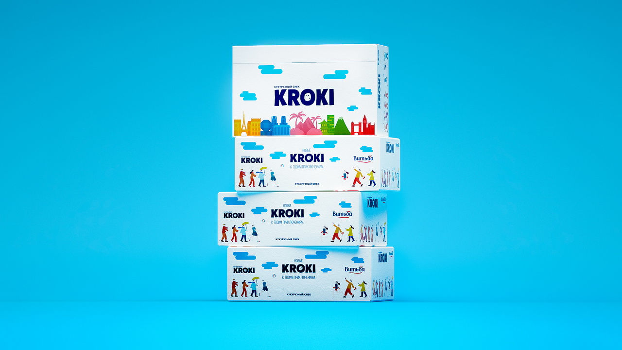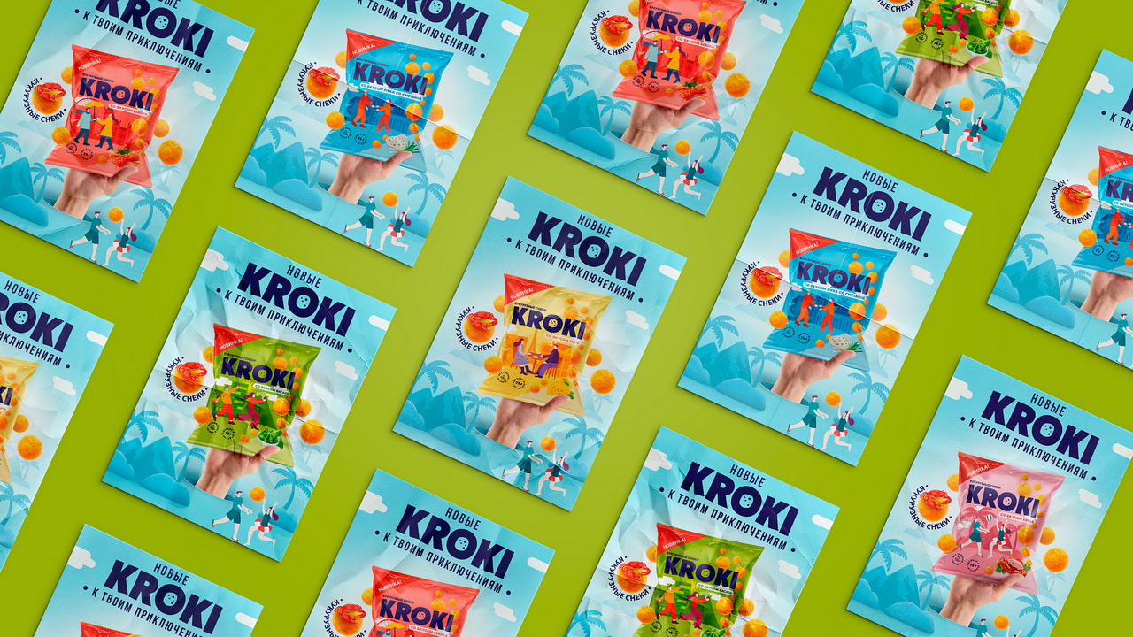KROKI — с белорусского «шаги». Название передает активность и динамичность бренда, отсылает к образу жизни потребителей. На упаковке изображены пары персонажей, которые «шагают по планете» в каждой стране пробуя новый вкус (например, сыр — Франция), дифференциация между SKU реализована за счет уникальных для каждого вкуса иллюстраций и цвета. Иллюстрации создают особый мир KROKI такой же насыщенный событиями и путешествиями, как и жизнь нашей аудитории.