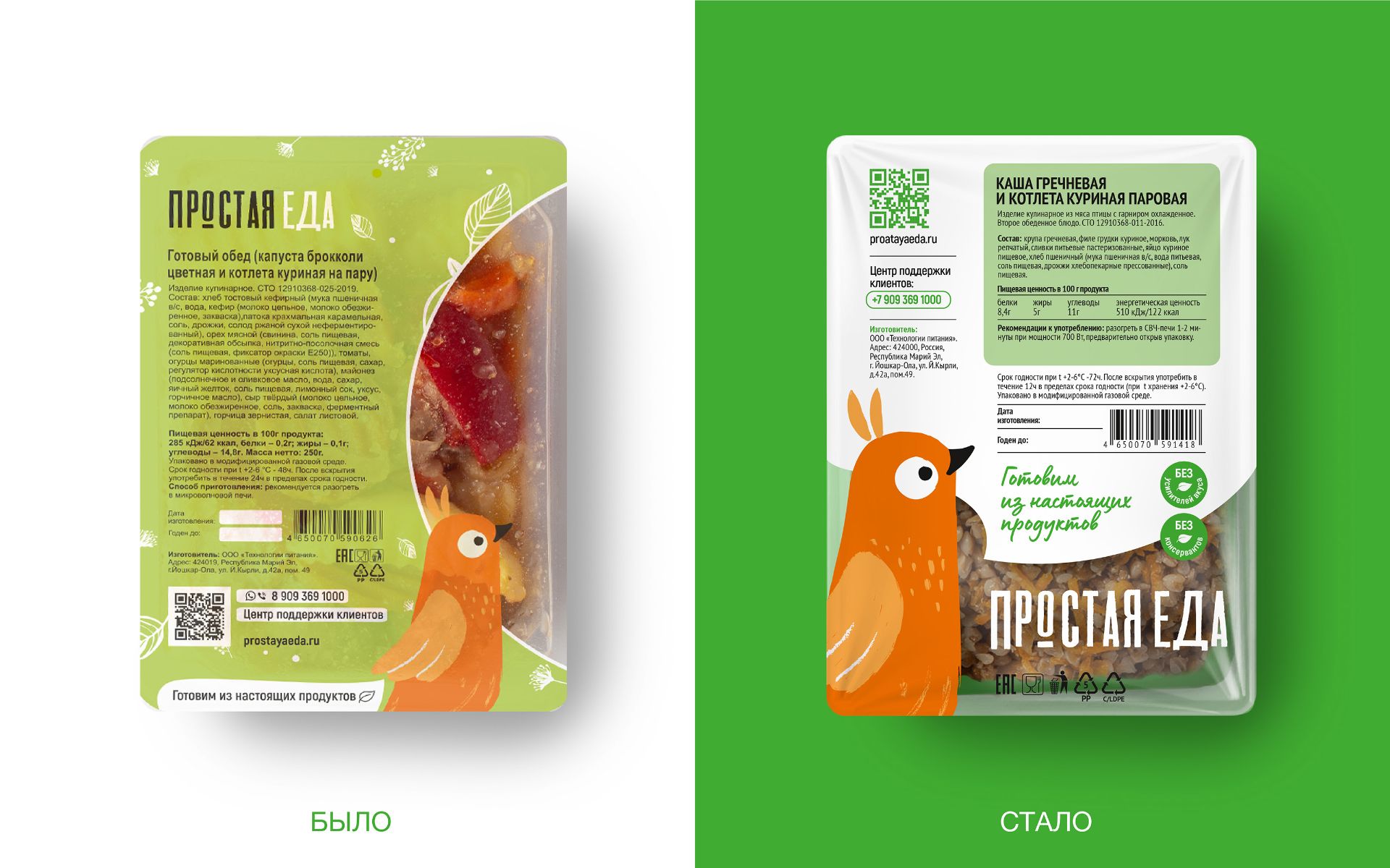 Специалисты Getbrand заметно увеличили персонажа, так как он по сути является главным идентификатором бренда. А саму упаковку визуально разделили на два сегмента: две трети занимает баббл в виде белого диалогового облака, в котором как будто сама птичка рассказывает про блюдо внутри, а внизу сделали прозрачное окошко, чтобы можно было увидеть еду и удостовериться в ее качестве. На белом фоне расположили всю информацию о блюде — его пищевую ценность, состав, рекомендацию к употреблению, клеймы и надпись «Готовим из настоящих продуктов», декларирующую суть бренда. Сама птичка теперь находится в левом нижнем углу, ее взгляд направлен на баббл с информацией. Логотип остался прежним, но дизайнеры сделали его крупнее и поменяли расположение, чтобы он стал заметным и запоминаемым. Архитектура упаковки стала более структурированной, четкой и понятной.