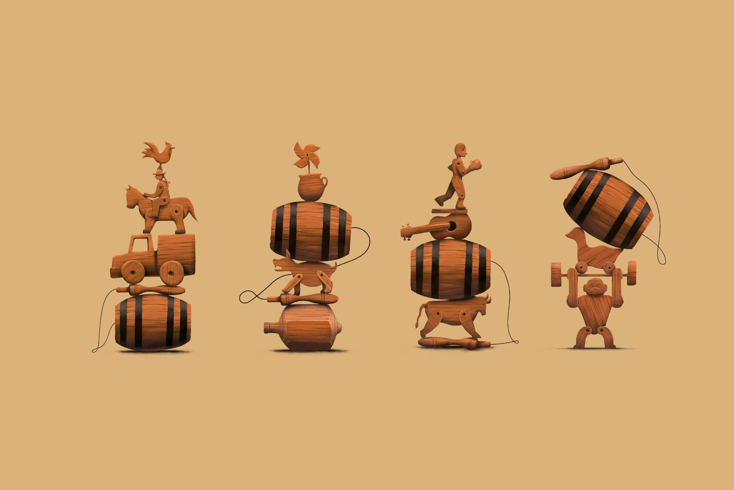 Решение было найдено в дереве: именно оно является символом тепла. Бочки сделаны из дерева, как и игрушки, изображённые на этикетках. Они вызывают ностальгию.
