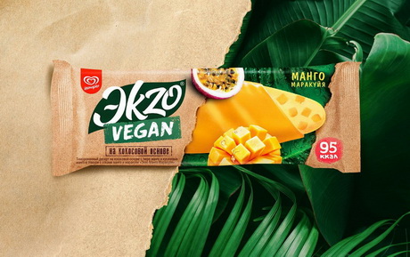 Новое мороженое Эkzo Vegan «манго-маракуя» — это сочетание вкуса тропических фруктов на кокосовой основе.