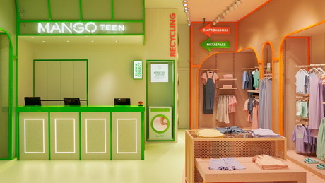Титулованная дизайн-студия из Валенсии Masquespacio завершила оформление интерьера барселонского магазина подростковой одежды Mango Teen. Целевая аудитория — подростки 11–13 лет. Магазин в гендерно-нейтральной цветовой гамме, оранжево-зелёных тонах, получился сюрреалистичным.