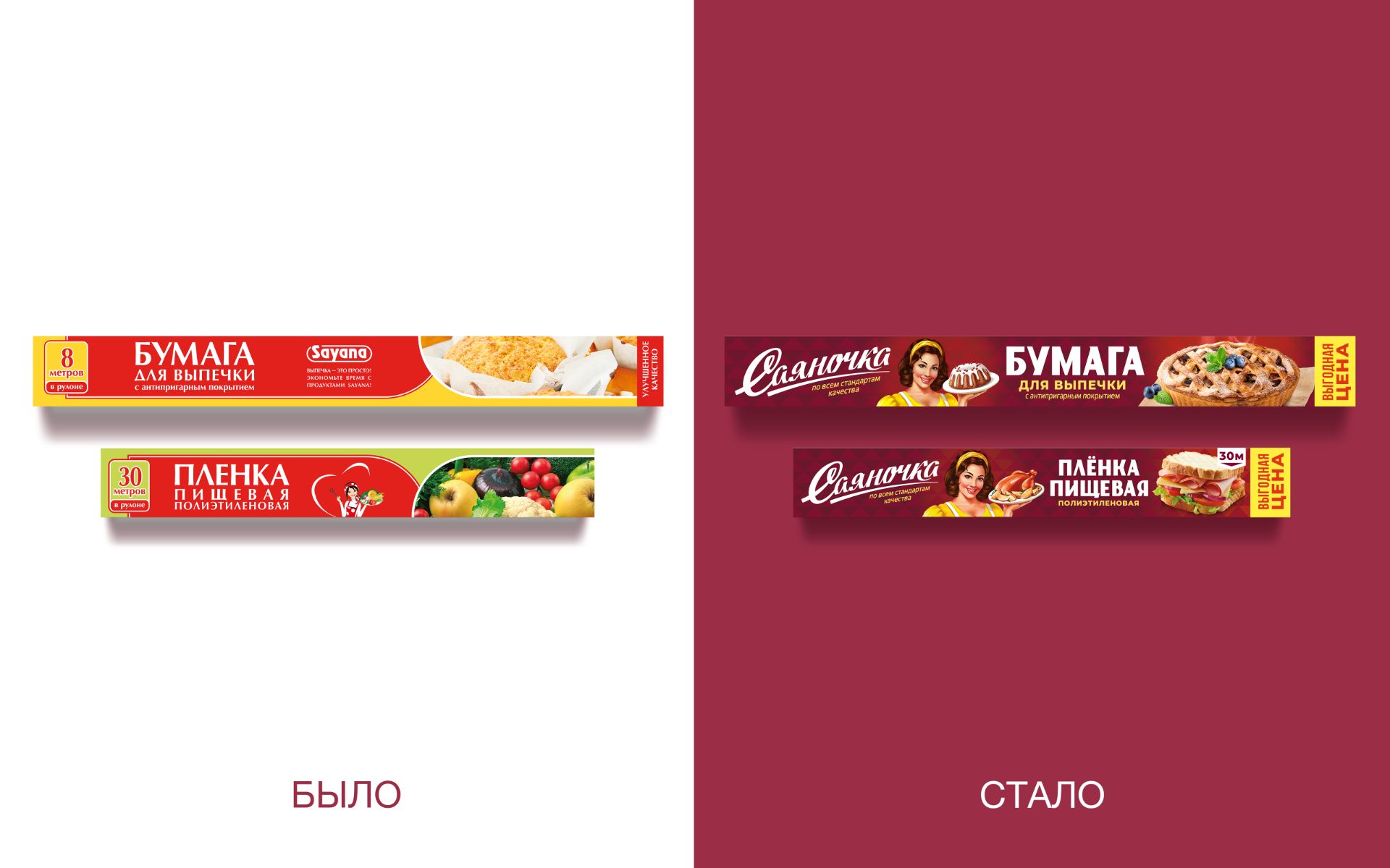 Новый дизайн бренда «Саяночка» сделан в ретро стиле — на упаковке изображена жизнерадостная хозяюшка, которая держит в руках приготовленное блюдо (торт или аппетитную курочку в зависимости от товарного SKU). Название бренда написано современным стилизованным под «60-е» шрифтом. Вкусная фуд-зона, яркий контрастный вишневый фон в сочетании с желтым блоком «выгодная цена» — выделяют продукт на полке среди конкурентов.