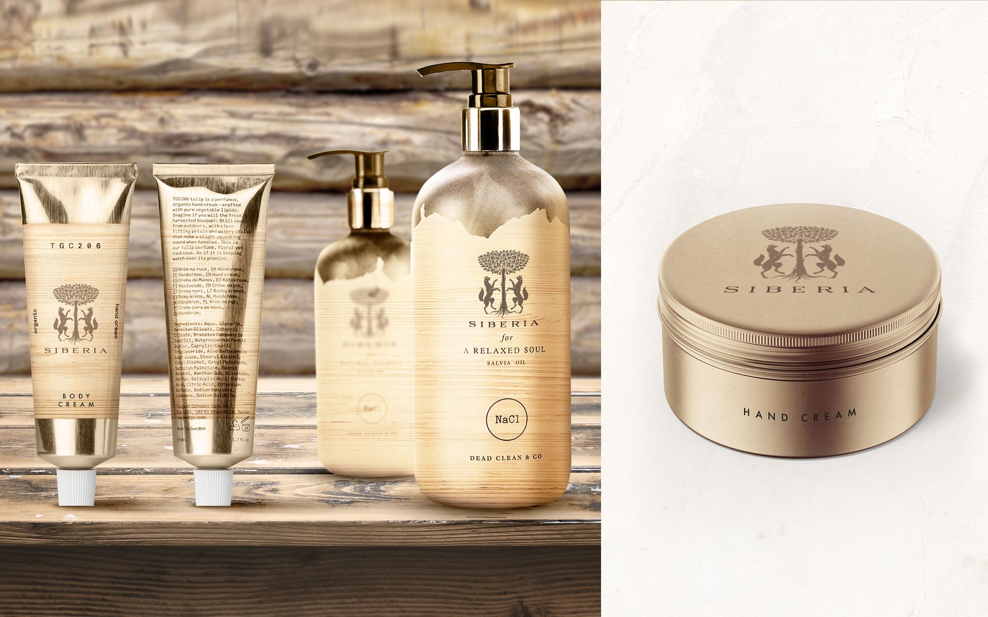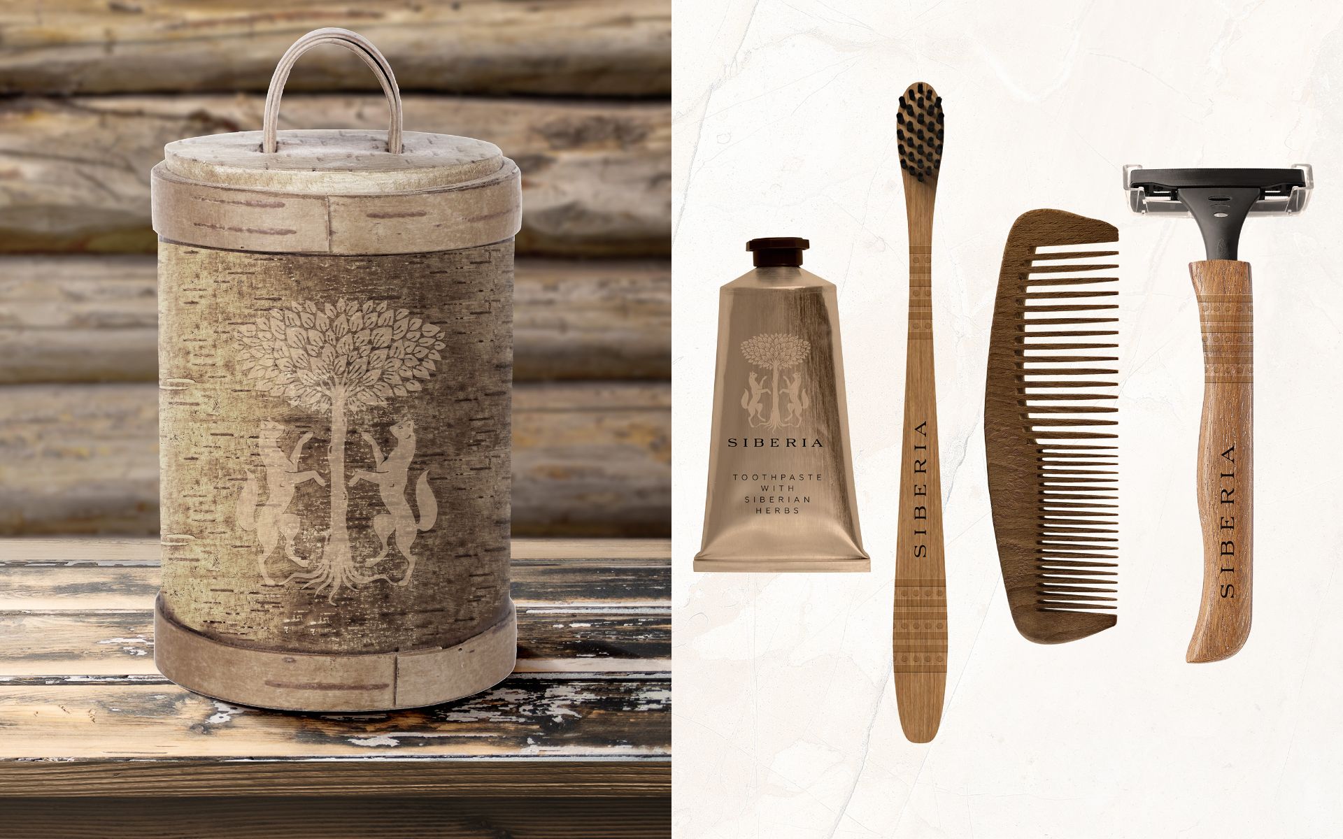 На этапе обращения в Getbrand уже был разработан логотип бренда «Siberia». Это эмблема, олицетворяющая богатство Сибири лесами и пушными зверями в виде дерева с раскидистой кроной по бокам от которого стоят два соболя. На его основе специалистам агентства необходимо было разработать фирменный стиль для банных комплексов и дизайн для целой группы продуктов — от капсульной коллекции банного текстиля до линейки собственной косметики и даже особого меню, специально разработанного Дмитрием.