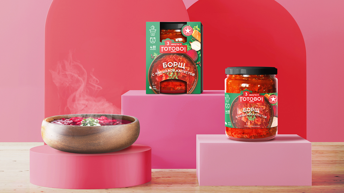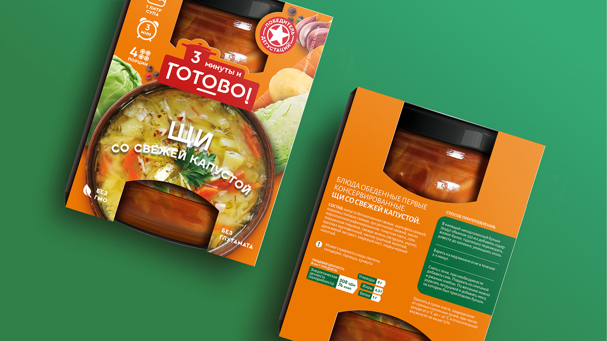 Торговая марка «Готово!» от ТД «Ярмарка» запустила линейку концентрированных готовых супов в стеклянных банках. Ассортимент ограничен 4 самыми популярными среди российских потребителей SKU: борщ из свежей капусты и из квашеной, щи из свежей капусты и рассольник. Перед командой агентства Otlichnosti были поставлены две задачи: отстроится от конкурентов с помощью дизайна упаковки и сделать образ продукта привлекательным для покупателя.