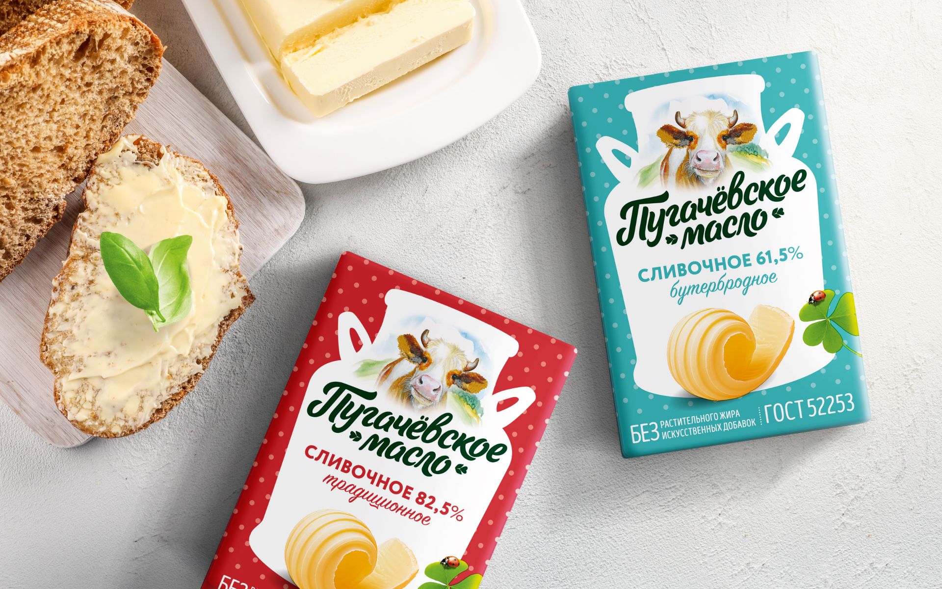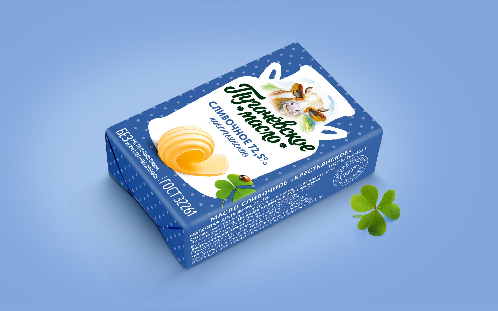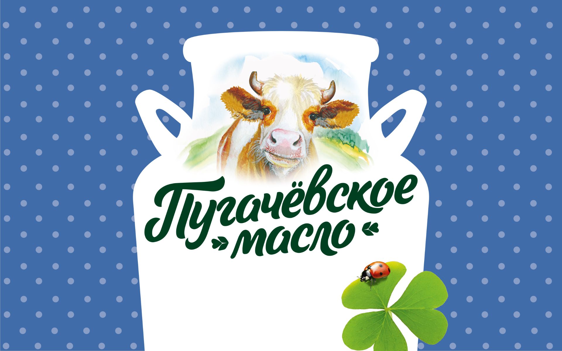 Клиент предоставил логотип в виде изображения коровы в круге, символизирующем солнце с надписью «Пугачёвские молочные продукты». В агентстве решили развить эту идею, немного изменив сам рисунок, сделав корову более четкой, запоминаемой и живописной, а лучи солнца – более мягкими. Надпись «Пугачёвское масло» написана крупным контрастным шрифтом. Все это имеет контрформу в виде молочного бидона с расположенной в его нижней части фуд-зоной. На упаковке указаны важные характеристики продукта — «без растительных жиров», надпись ГОСТ и добавлены милые детали в виде листочка клевера с божьей коровкой. Все эти элементы создают образ натурального продукта, который очень заметен на полке и составляет достойную конкуренцию окружающим его брендам.