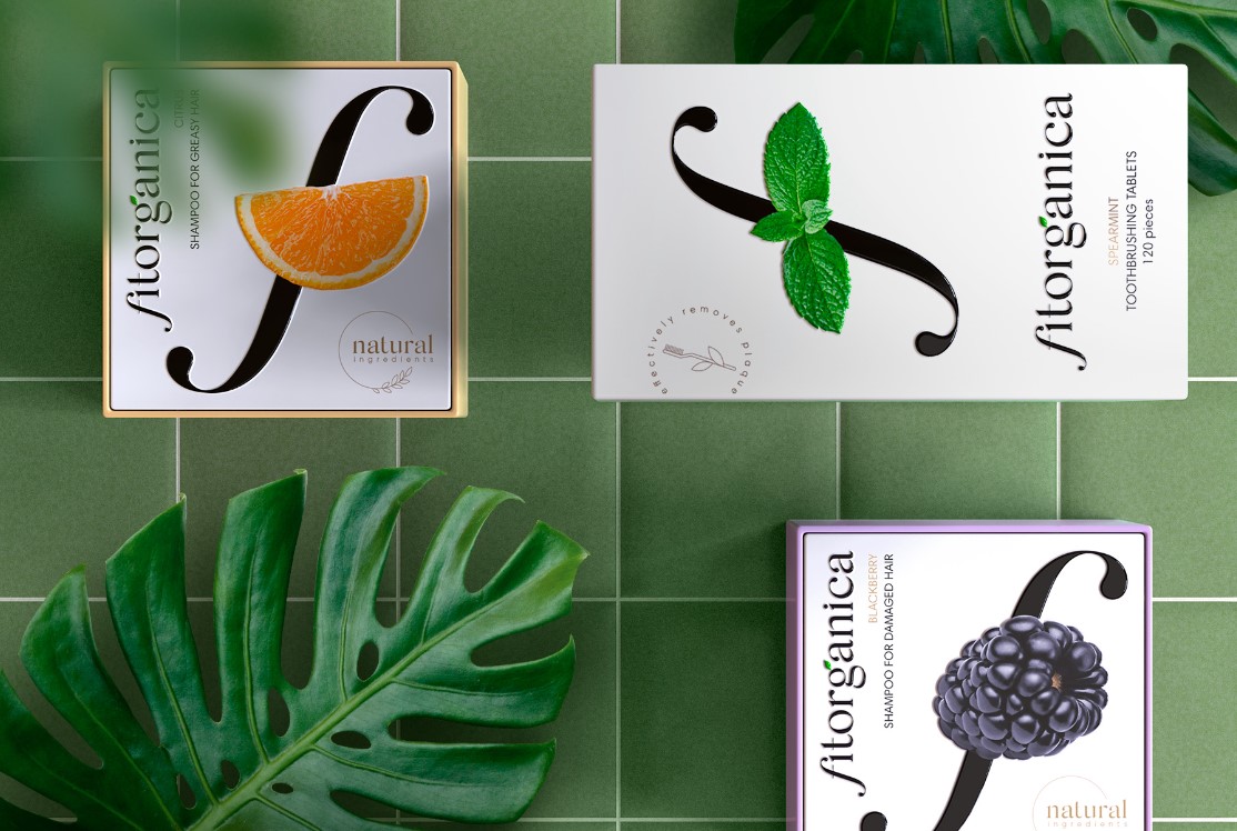 Fitorganica — новое слово в мире органической косметики. Ключевым образом дизайна стала литера f с различными ароматическими дифференциаторами вместо горизонтальной штамбы.