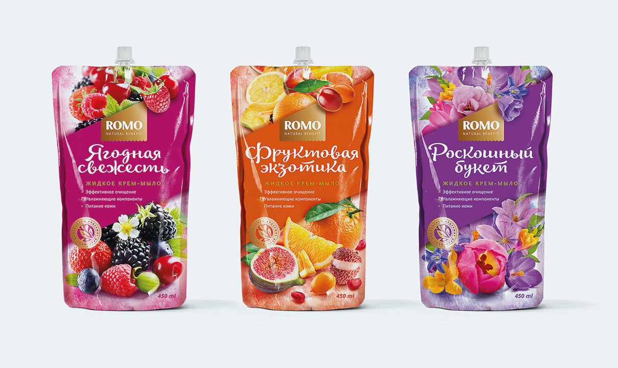 При разработке упаковки жидкого мыла и гелей для душа ставилась задача создать максимально яркий и привлекательный образ. Необходимо было решить проблему с заметностью упаковки на нижних полках торговых центров.