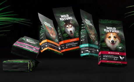 Первое, на что покупатель обращает внимание, глядя на упаковку Wild Nature, — это яркая мордашка домашнего питомца, который с любопытством смотрит на вас из зелёных зарослей. Задача такого подхода издалека привлекать внимание к выставленному на полке товару и создавать особое настроение.