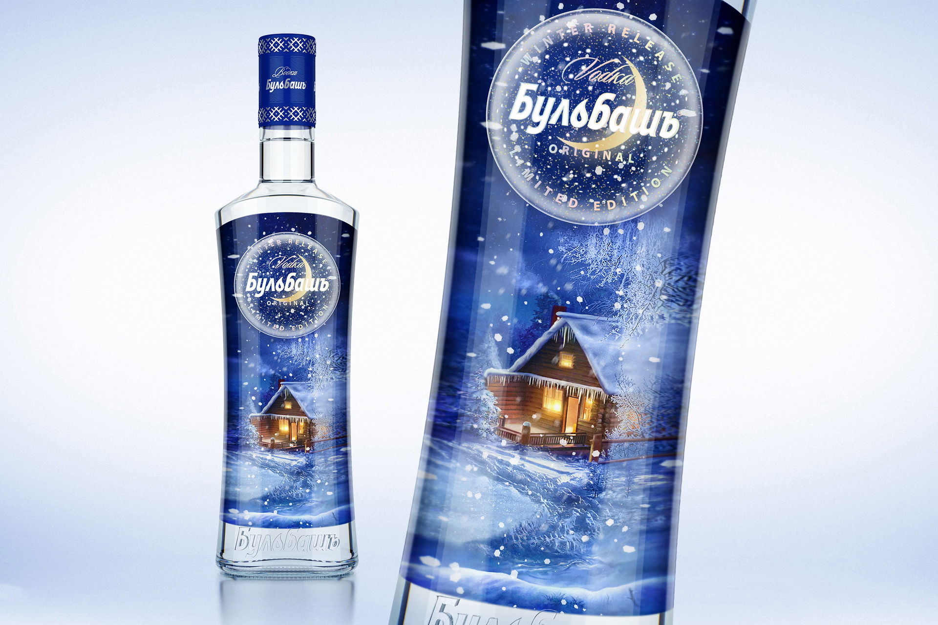 В сложные времена люди больше тянутся к чему-то уютному и душевному — именно такой образ и создает новая LIMITED EDITION 2023. Дизайн концепция состоит из двух частей, взаимодействующих между собой. Традиционный круг Бульбаша в этот раз превратился в снежный шар (популярный во всем миру сувенир — символ Рождества и Нового Года), снег из которого просыпается на иллюстрацию на заднем плане бутылки. На внутренней стороне контрэтикетки изображен заснеженный пейзаж и гостеприимный домик с теплым светом в окнах, куда хочется попасть. Золотистый месяц, словно блик на шаре — архетипный образ зимней сказки. Динамическая композиция меняется при перемещении вдоль полки, привлекая внимание покупателя.