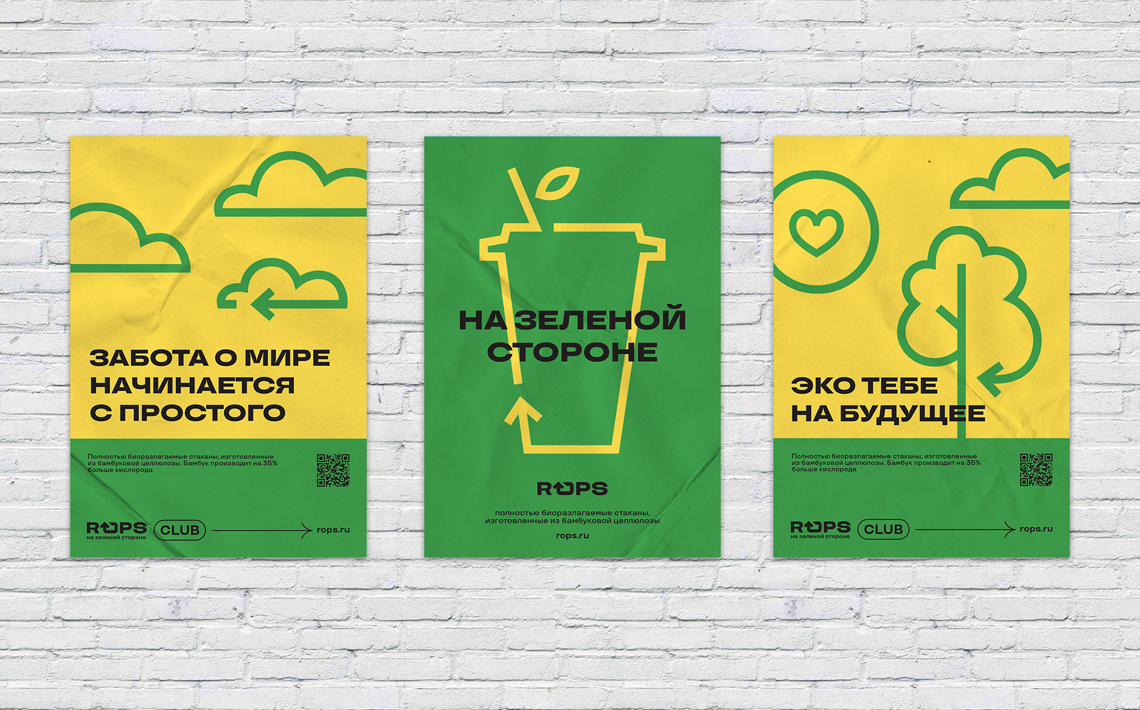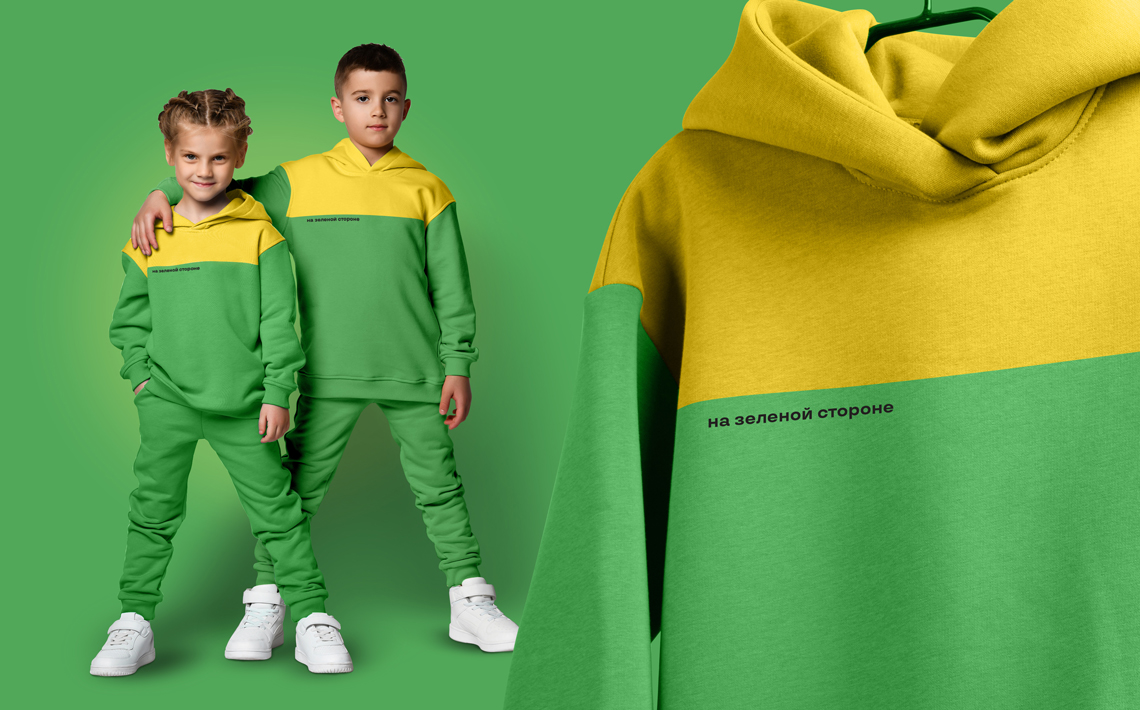 Основная идея бренда заключается в том, что действовать экологично — это просто. Слоган «На зеленой стороне» хорошо раскрывает главный посыл, а фирменный стиль визуально поддерживает эту мысль.