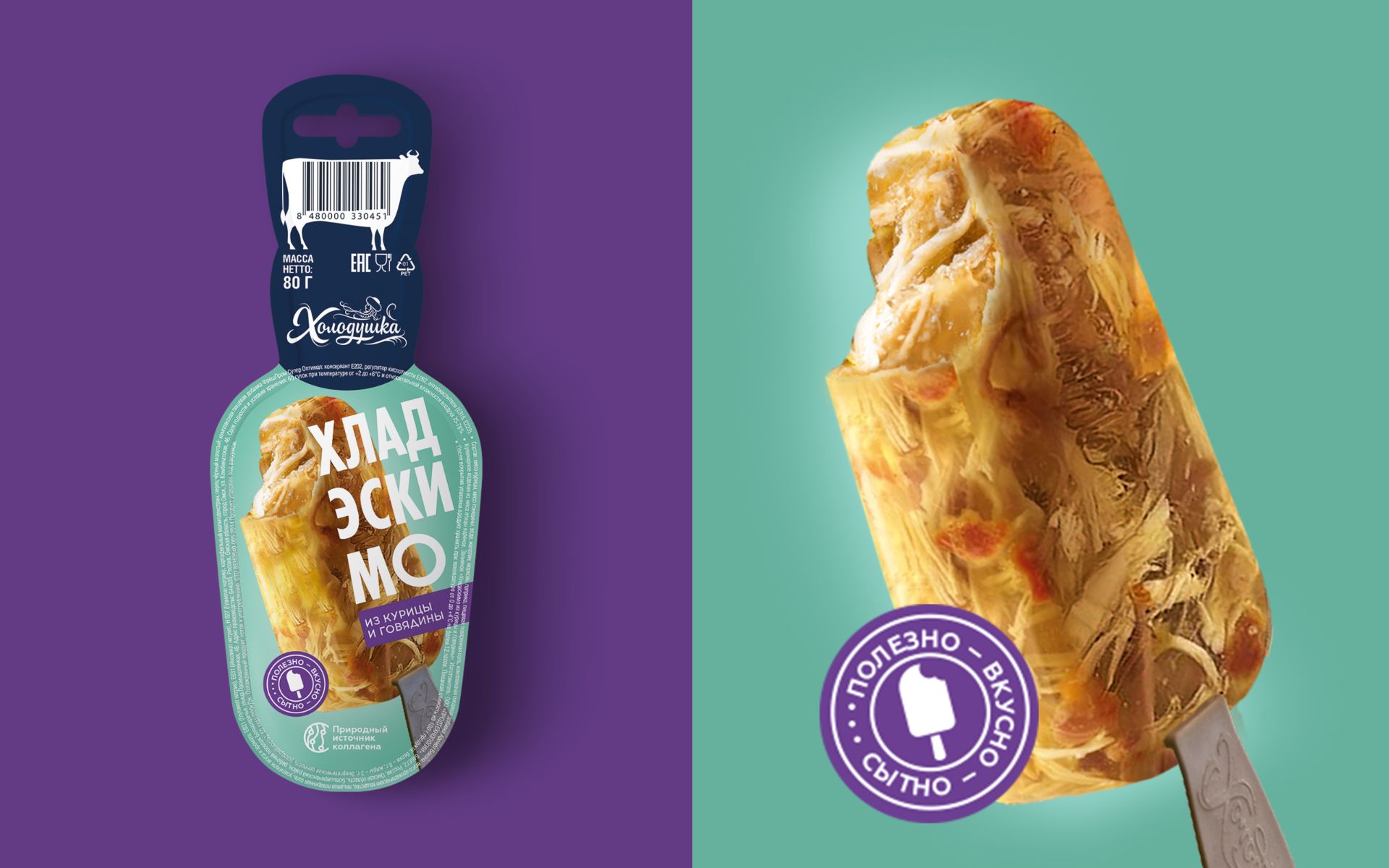 Необходимо было разработать дизайн упаковки для нового бренда холодца на палочке «ХладЭскимо». Дизайн должен быть понятным для потребителя, транслировать вкус, натуральность и пользу продукта, вызывать ощущение сытости, а также демонстрировать удобство нестандартного формата традиционной продукции.