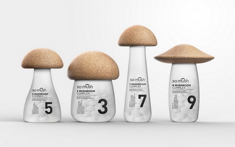 Заметную форму решили использовать дизайнеры в упаковках биологически активных добавок SO MUSH. Поскольку одним из ингредиентов БАДов являются грибы, решено было отразить это в упаковке.