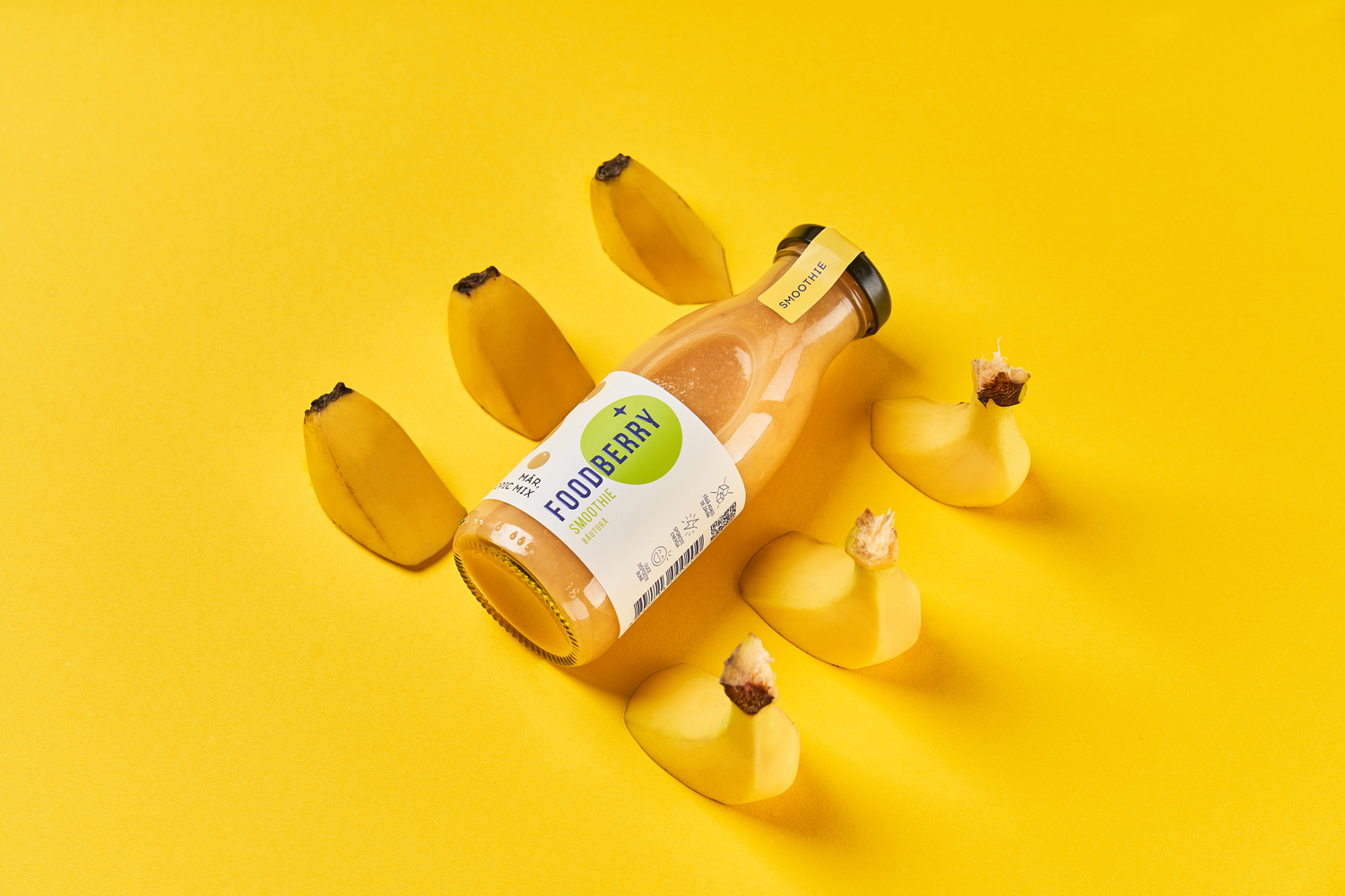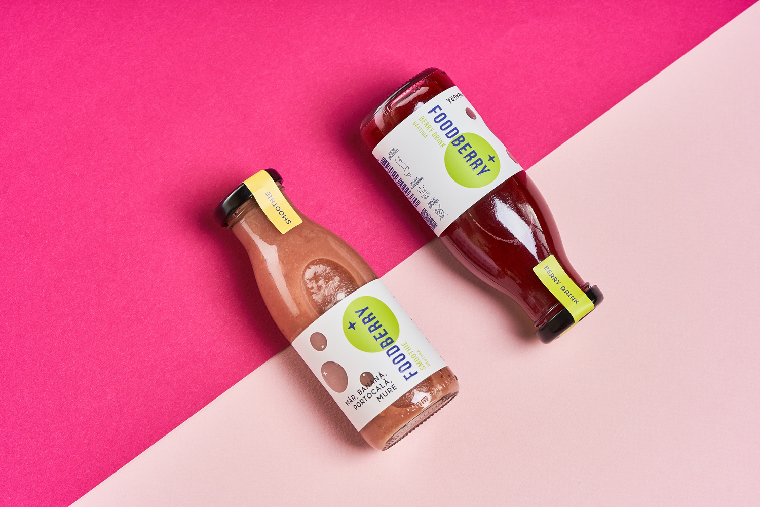Дизайн упаковки для натуральных напитков Foodberry подчёркивает его основные характеристики: натуральность, полезность, свежесть. Поэтому акцент в дизайне поставлен на минималистичность и эргономичность, что делает напиток похожим скорее на некий эликсир из аптеки, нежели продукт фаст-фуд индустрии.