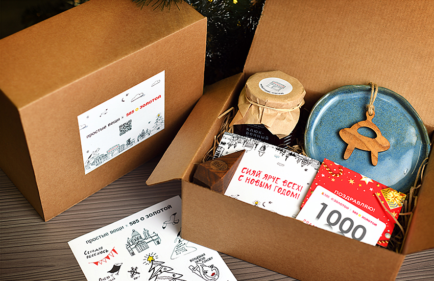 Создание боксов сопровождалось добрым комиксом, который ювелирная сеть «585*ЗОЛОТОЙ» публиковала в своих соцсетях — подписчики могли влиять на сюжет и в конце выиграть сами подарочные наборы. Весь проект выполнили в едином стиле: герои сюжета и забавные авторские виды Санкт-Петербурга (родного города и сети «585*ЗОЛОТОЙ», и мастерских «Простые вещи») появляются на стикерах, баночках джема, макетах в соцсетях, подарочных открытках.