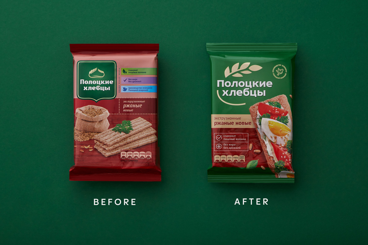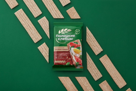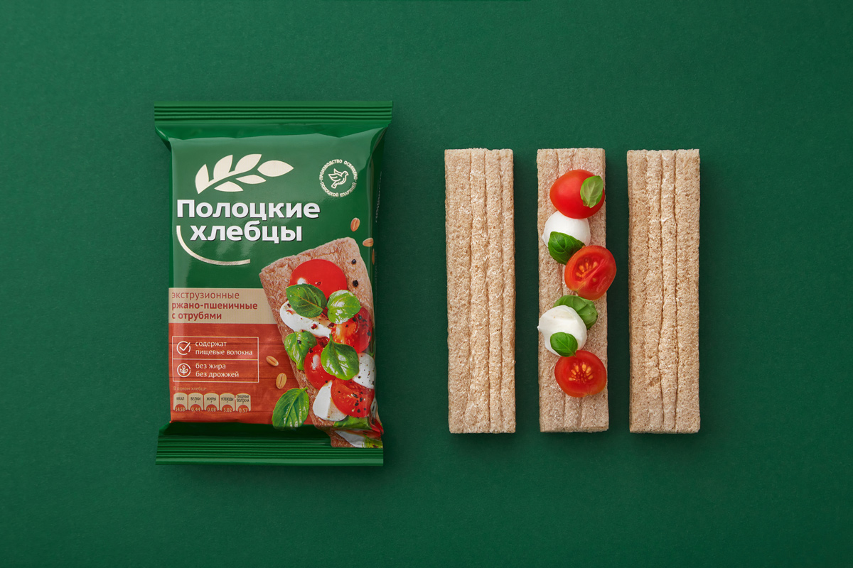 Первый шаг в редизайне — усиление роли бренд-зоны упаковки. Это помогло обозначить позицию на рынке: «Полоцкие хлебцы» — узнаваемый, качественный и любимый потребителями продукт.