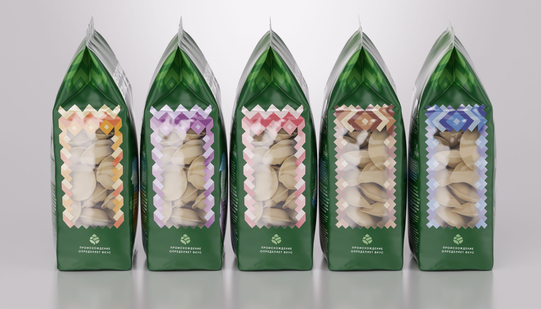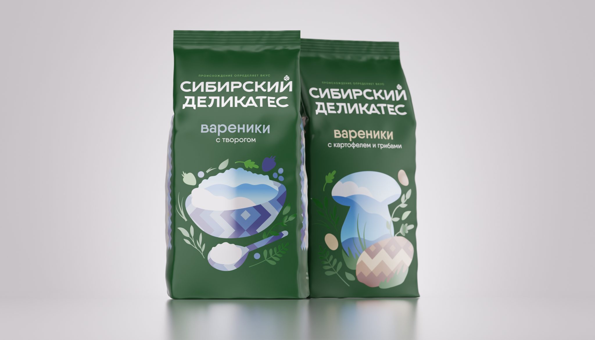 Основную часть упаковки занимают иллюстрации, отражающие начинку. Контурные формы начинки для пельменей и вареников заполняются абстрактным изображением сибирских гор, чистого неба и локальными паттернами. «Парящие» вокруг графические ветки и листья усиливают природный эффект. Такой дизайн наглядно отражает качество и вкус продукта, выгодно выделяя упаковку на полке.