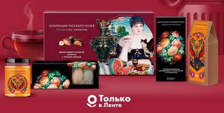 «Лента» и Русский музей отобрали ряд произведений русского искусства, в том числе образцы народного творчества, дополняющих тему чаепития. Изображения украшают упаковки коллекционных наборов, включающих чай и десерты.