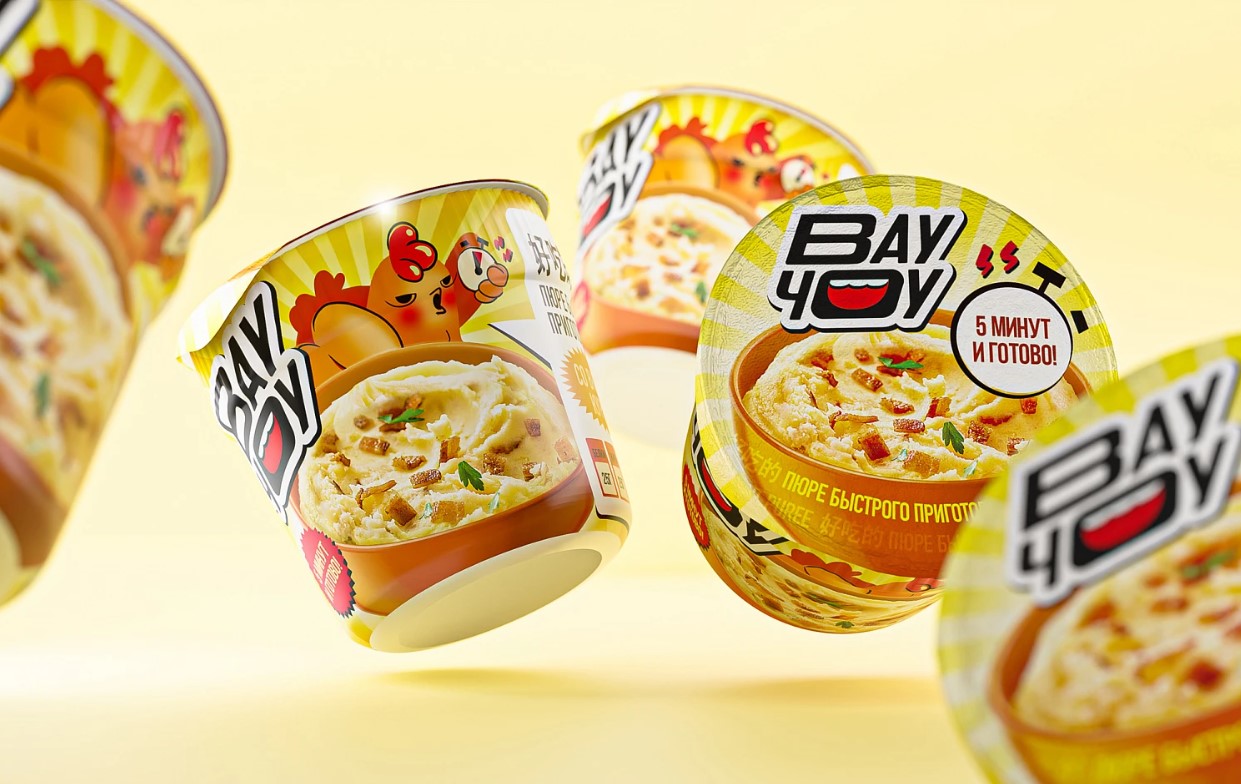 Разработкой дизайна упаковки Wow Chow специалисты агентства вдохновлялись, опираясь на эстетику азиатских комиксов. В основе динамичного логотипа присутствует широкая улыбка. Сам центр сюжета выстраивался на вкусной и аппетитной фудзоне, которая является важным кодом категории блюд быстрого приготовления.