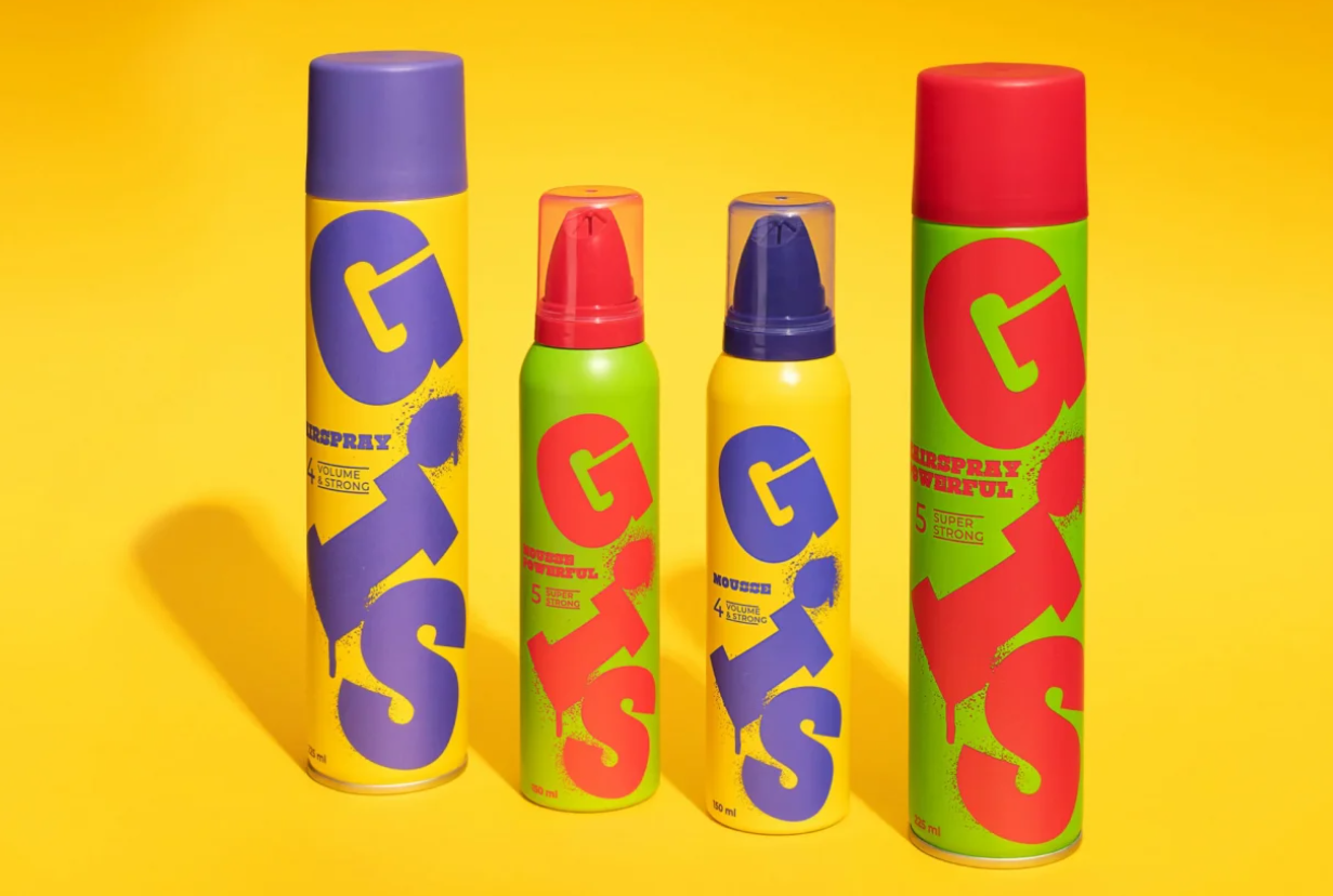 Вёрстка и выбор цветовой палитры в визуальной концепции GIS отходят от привычных строгих правил. Каждое SKU сочетает в себе насыщенные контрастные оттенки и крупный динамический логотип — расположение букв и элементов может меняться от упаковки к упаковке. Линейка может быть значительно расширена новыми позициями за счёт большой вариативности сочетаний фирменных и дополнительных цветов. Эффект небрежного распыления краски, вдохновлённый уличным искусством, выделяет GIS на полке и создаёт образ дерзкого и современного бренда, который релевантен для молодой целевой аудитории.