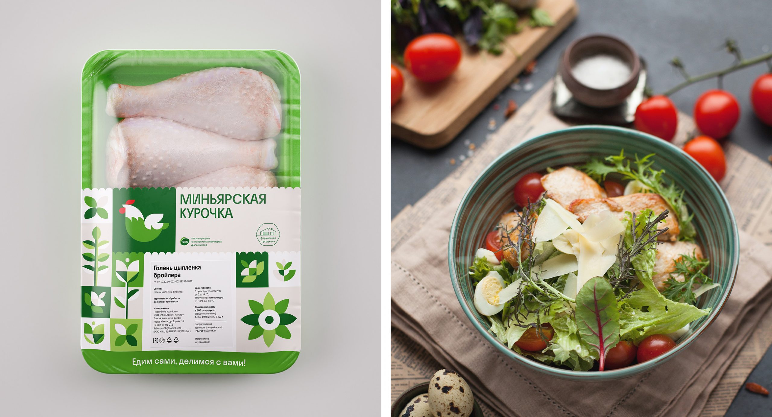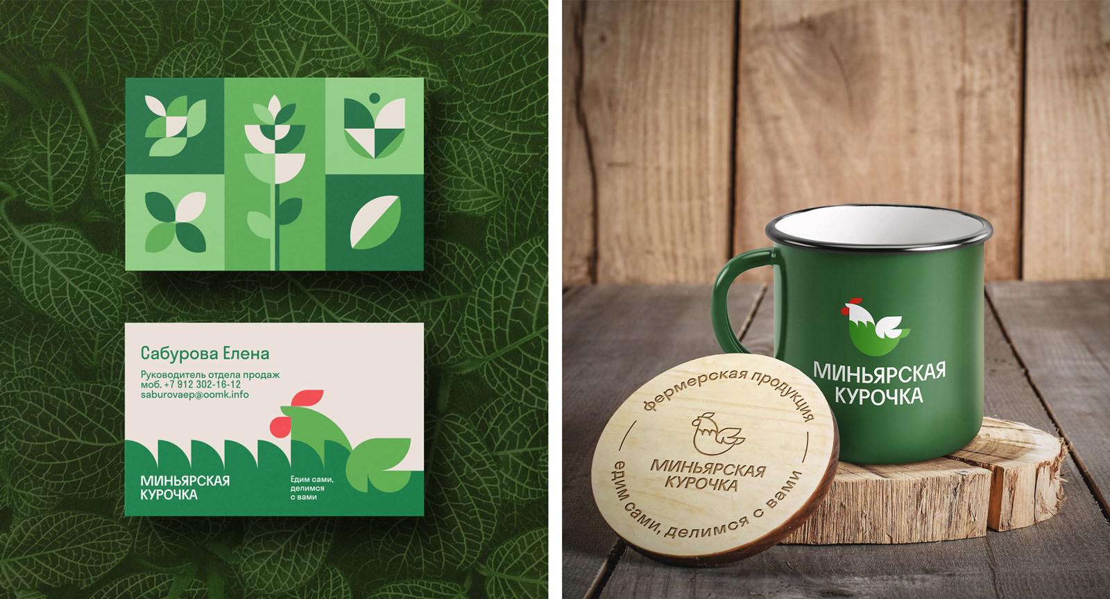 «Миньярская курочка» выращивается в чистом районе, без использования антибиотиков и других вредных добавок. Эко-ферма делает все, чтобы каждая птица получала чистую воду и здоровое питание. Такую заботу дизайнеры отразили в фирменной графике в виде полевых цветов и растений. Цветовая палитра из природных оттенков поддерживает идею натуральности. Посыл отражен и в лаконичном графическом знаке — образе курочки из зеленых листочков. Логотип из нарочито простого, рубленного шрифта поддерживает эко-мотивы.