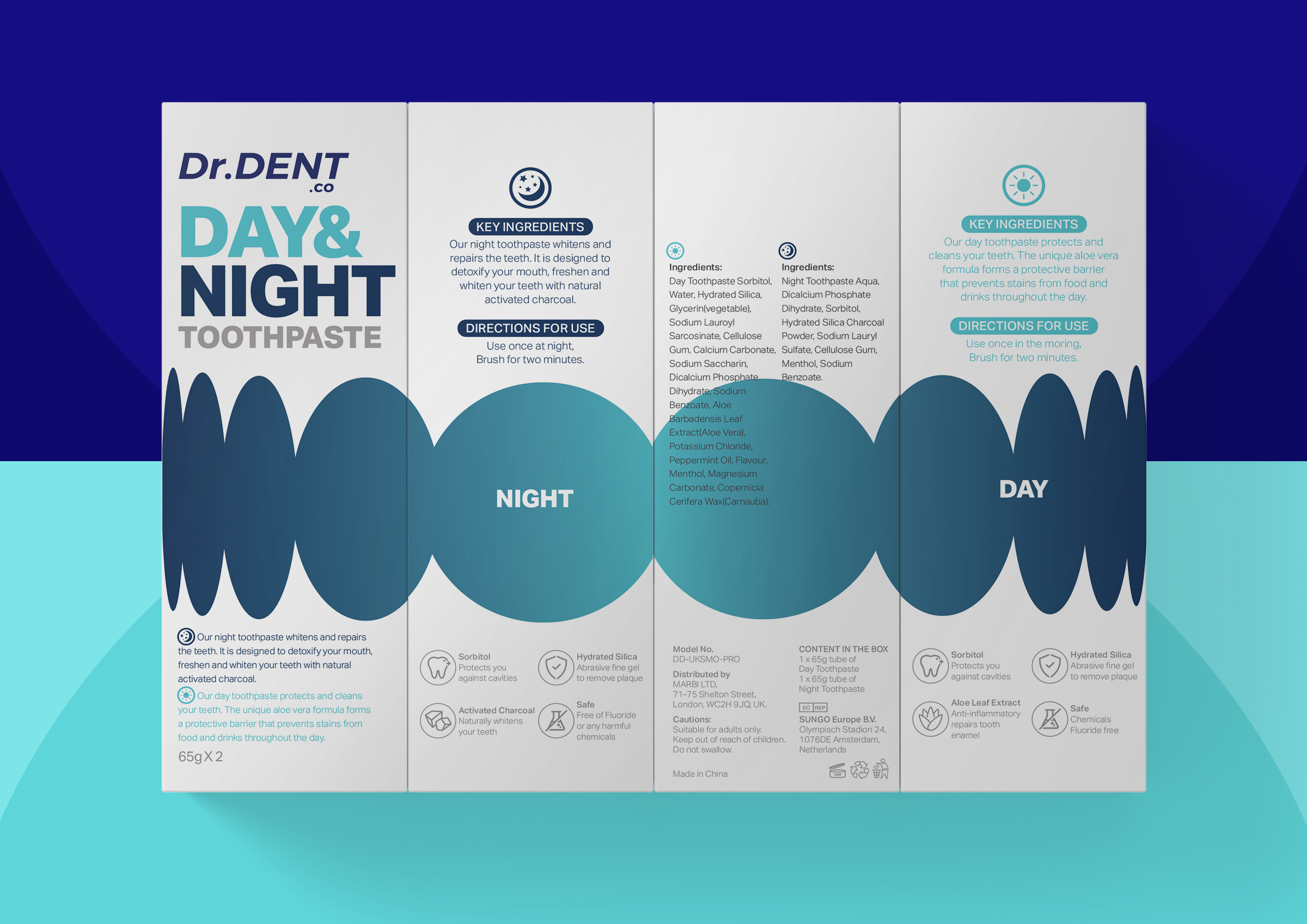 Идея для упаковки появилась из процесса смены дня и ночи — солнца и луны. Простая и современная визуальная планировка и абстрактный ряд зубов передают сообщение о необходимости заботы о полости рта и днём, и ночью. Помимо олицетворения профессионализма и инновационности бренда, такой дизайн позволяет укрепить доверия потребителей.