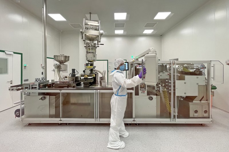 Рядом расположен еще один участок — по упаковке препаратов в капсулы. «Он выпускает лекарства бесконтактным способом — 9 тысяч блистеров в час», — демонстрирует работу нового оборудования главный механик Антон Панкратовский.