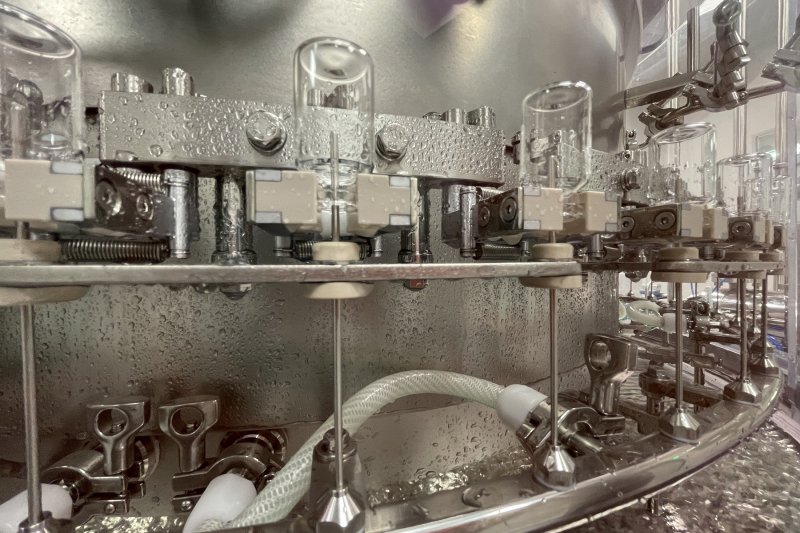 Главный инженер Олег Дяшкин рассказывает: «Здесь производится выпуск высокоактивных препаратов. Сосредоточен весь процесс — начиная от мойки флаконов, стерилизации, розлива, укупорки, финишной мойки, визуального контроля качества и лиофилки». Видимая часть производства расположена на первом этаже здания, а есть еще второй этаж, откуда линию обеспечивают водой, воздухом и другими компонентами. Там же находятся бибофильтры, которые защищают окружающую среду от выбросов вредных веществ. Обслуживают линию всего четыре оператора, притом, что ее мощность — 200 готовых флаконов с лекарством в минуту.