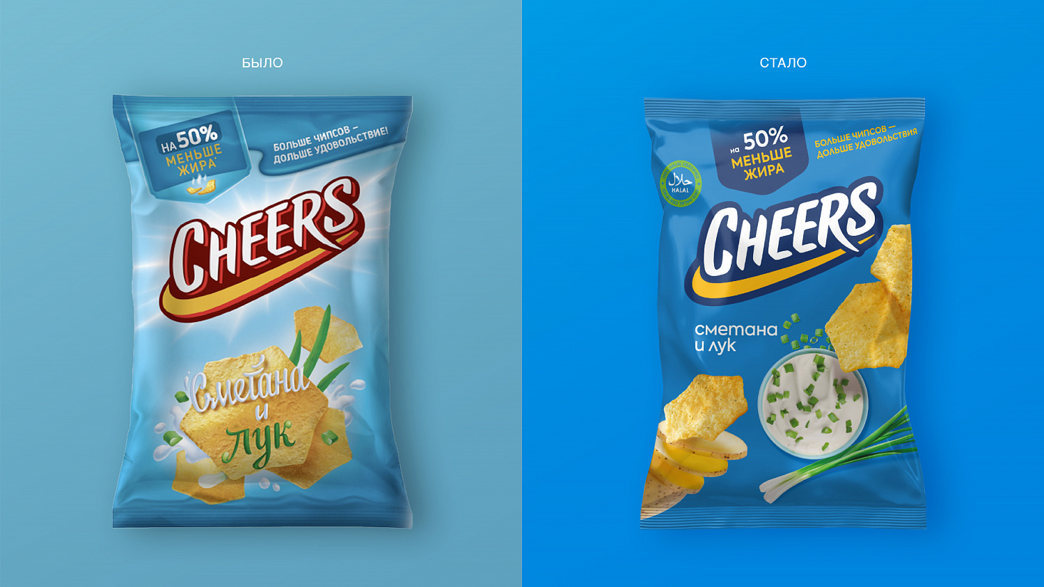 Сохранился клейм «на 50% меньше жира» в левом верхнем углу упаковки, однако он, как и логотип, стал более минималистичным. Продукт соответствует всем требованиям халяльной продукции, поэтому было принято решение вынести клейм «халяль» в левую часть упаковки. Также сверху расположили слоган «больше чипсов — больше удовольствия».