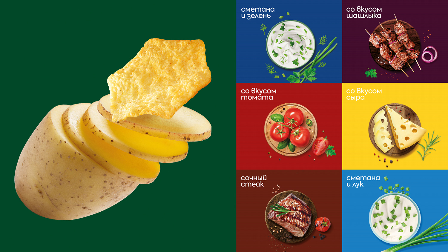 Дизайнеры видоизменили логотип — центральный элемент на пачке чипсов. Типографика стала более мягкой и скругленной. Цвета обводки зоны с логоблоком теперь соответствуют цветовому кодированию вкусов: голубой — сметана и зелень, зелёный — лук, коричневый — стейк и тд. Оттенки упаковок, в свою очередь, стали более яркими и аппетитными.