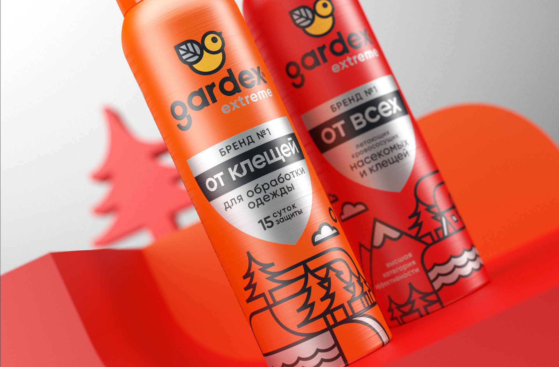 Компактный блок в центре концентрирует всю главную информацию о продукте, здесь все структурировано и понятно потребителю. Плоский стиль во всем: в иллюстрации, в клеймах, в лого. Экстремальная линейка сохранила ключевой элемент — щит, символ надежной защиты. Для GARDEX NATURAL в этом же стиле была изображена веточка.