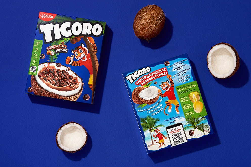 Дизайн упаковки визуально гармонирует с харизматичным Tigoro, так как содержит много объемных элементов: отдельно отрисованные маркеры вкуса, яркий и аппетитный фотостиль фудзоны. Основным бренд-цветом был выбран синий, контрастирующий с шерстью персонажа. Массивный логотип обеспечивает баланс компонентов дизайна, при этом не перетягивая все внимание на себя. Упаковку, разработанную агентством, можно легко идентифицировать на полке, а также ее просто интересно рассматривать.